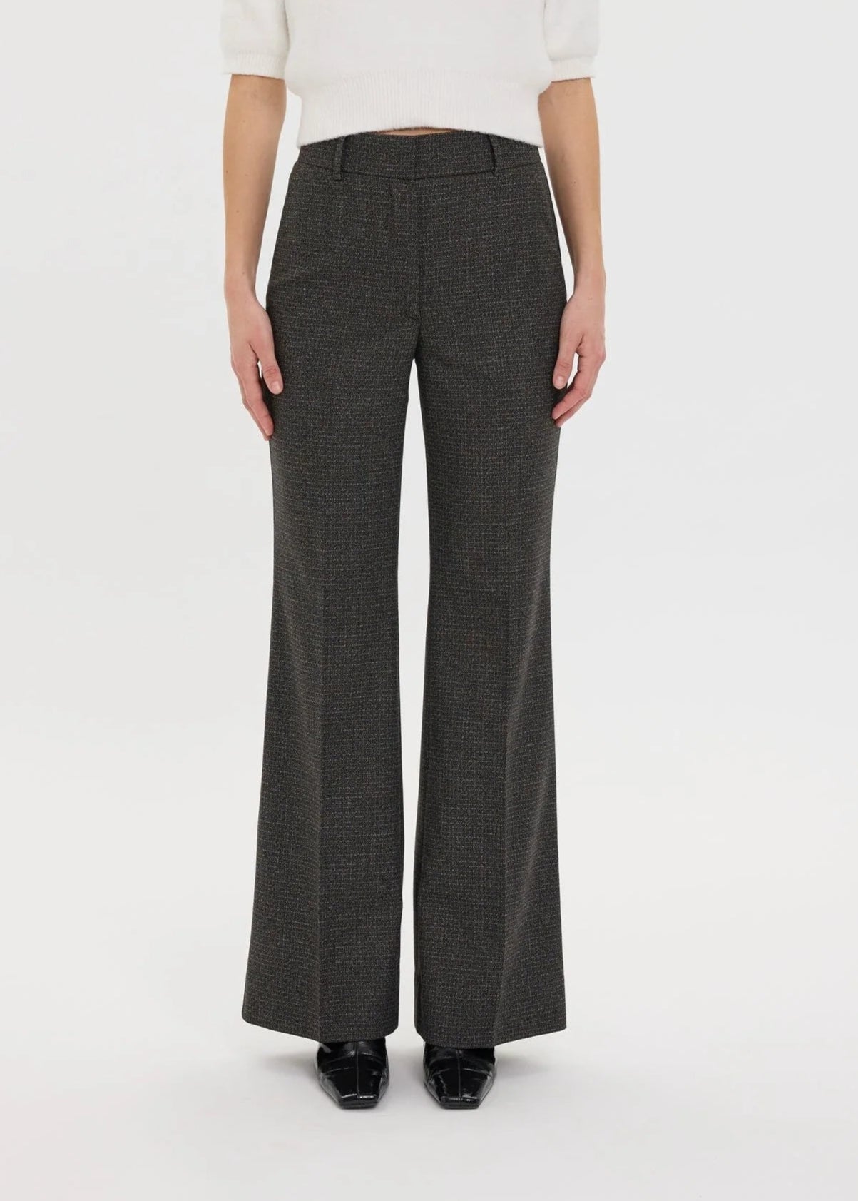 OliviaFV-buksen har en avslappet og utsvingt passform. Den høye midjen er formet for å sitte flatterende i livet, fremheve hoftene og lårene, og buksen vider seg elegant ut fra litt over knærne. Stoffet har en lett tekstur med diskret fargespill, som gir buksen en sofistikert overflate og et eksklusivt uttrykk – perfekt til både hverdags og mer oppdressede anledninger. De vide bena og den elegante silhuetten gjør det enkelt å style buksen på ulike måter.