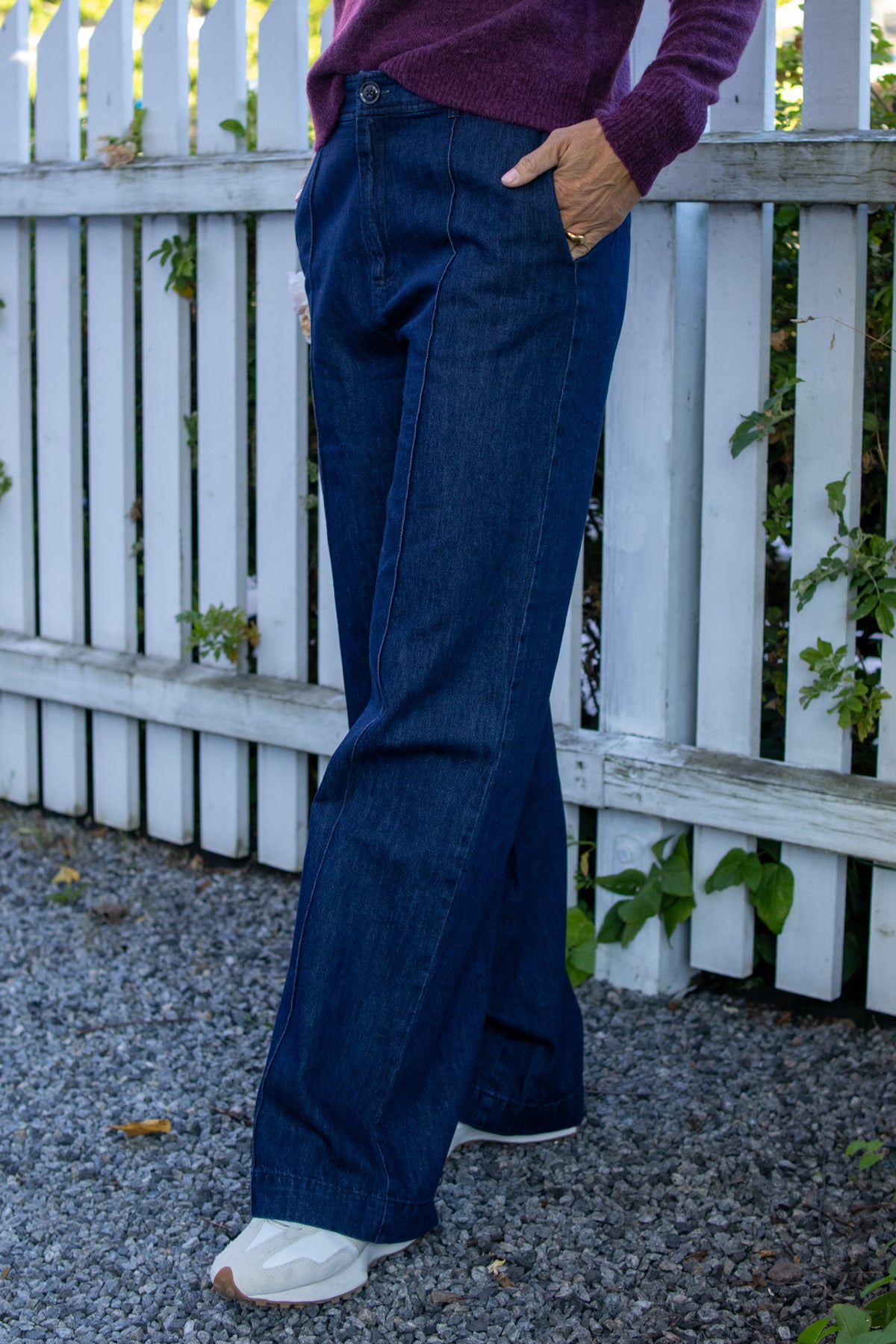 "Sarana pant - Rinse Blue Denim" fra Part Two har vide, rette ben og pressefolder som gir et elegant preg. De er laget i en myk bomullsblanding med sidelommer og beltehemper. Style dem med en skjorte eller blazer for en avslappet men sofistikert look.