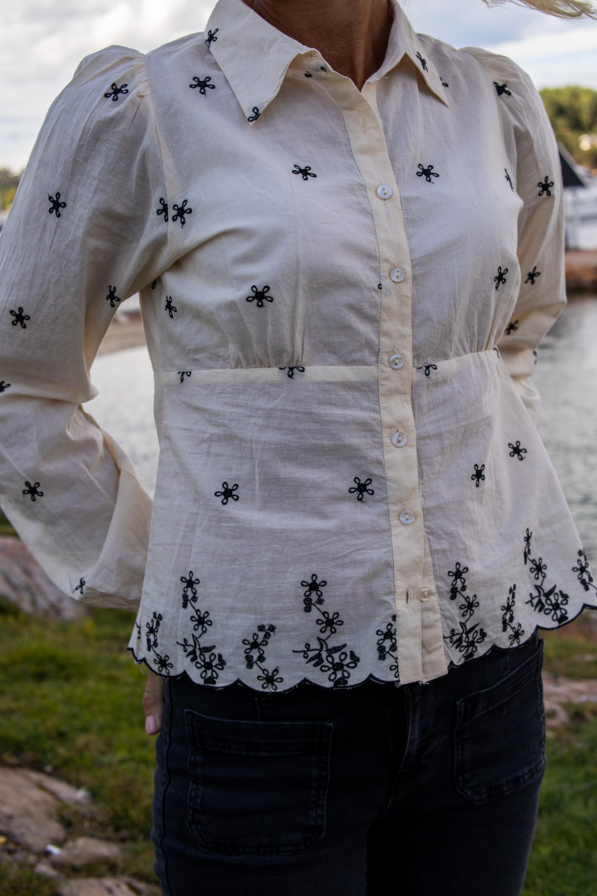 "Live Blouse - Buttercream Embrodery" har lange volumiøse puffermer med elastiske mansjetter og en litt tettsittende midje som skaper en flatterende silhuett.