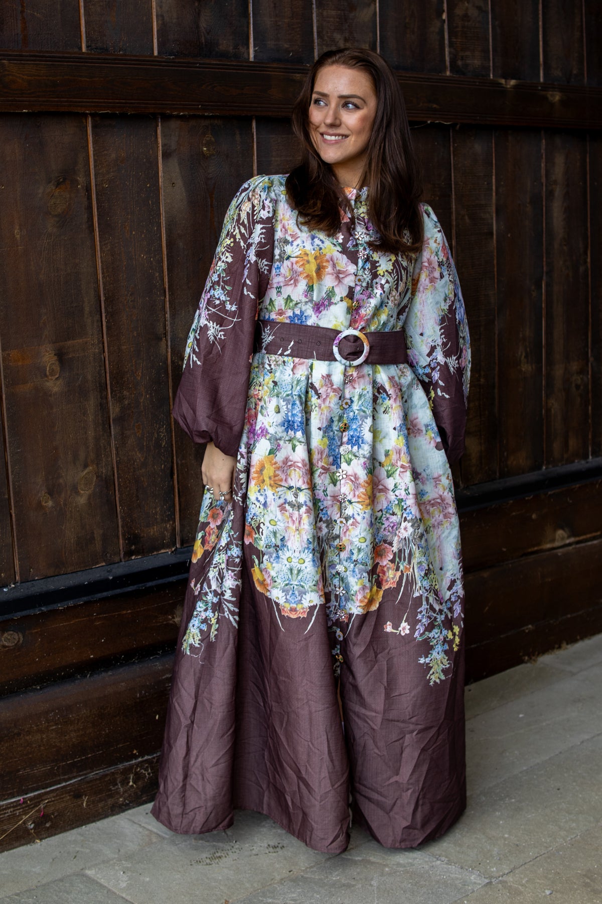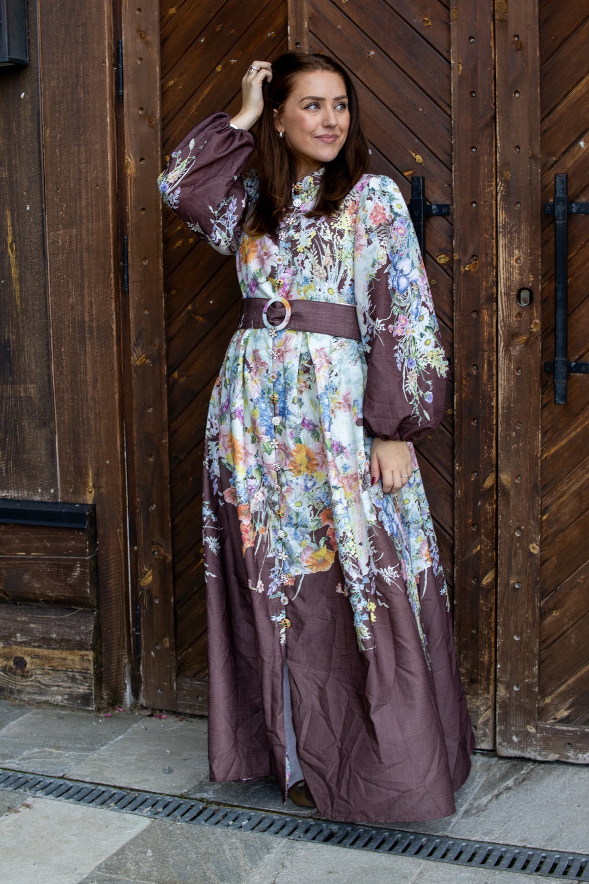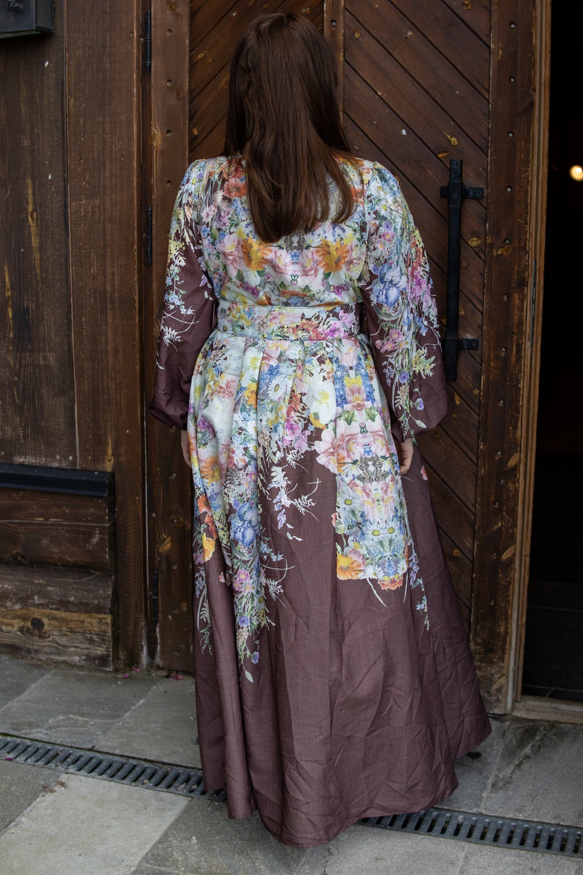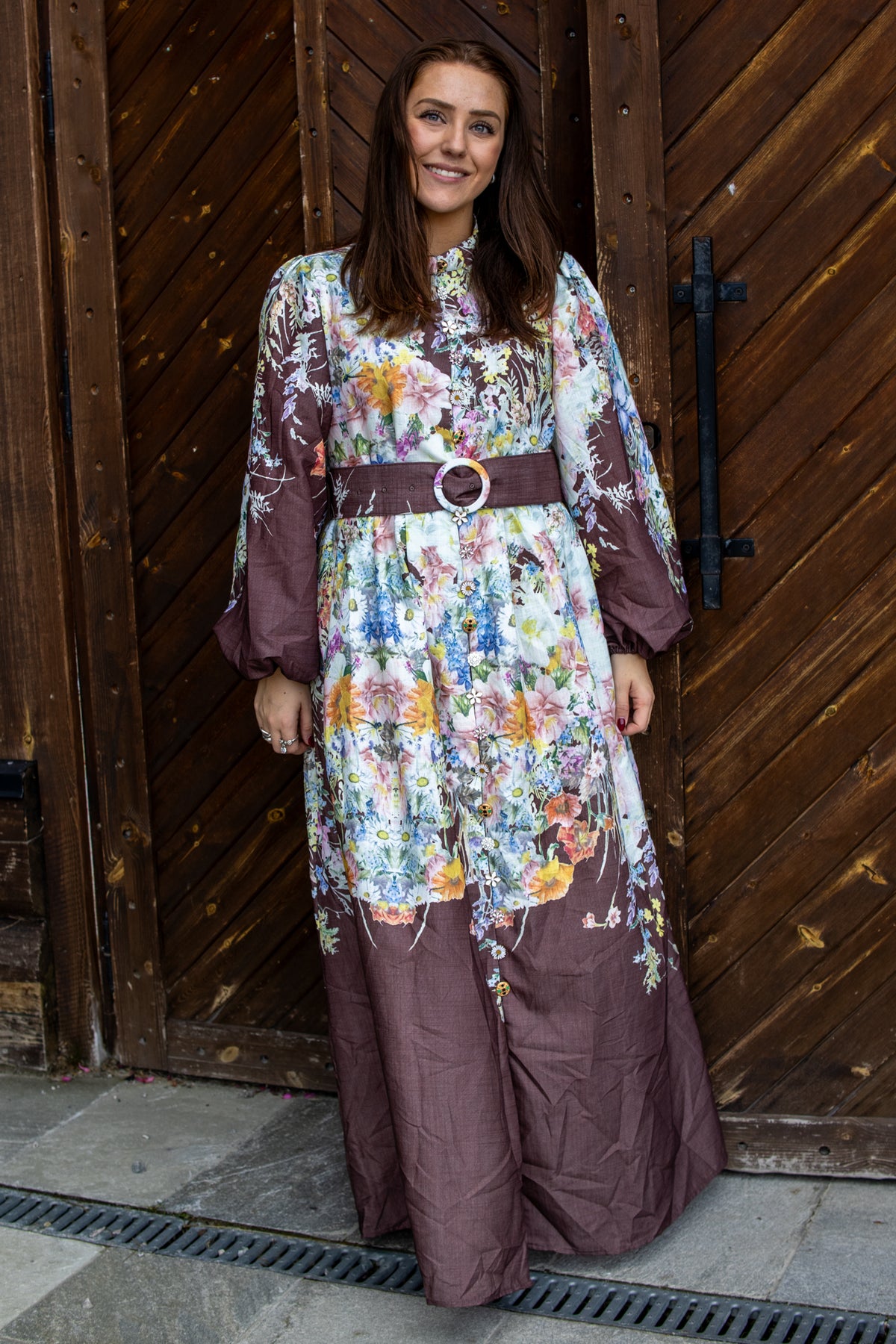 "From Paris with Love kjole - burgunder m blomster". Den har blomstermønster i nydelige rosa, gult og blått på en burgunder/brunlig base. Lange ermer med puff gir den et feminint og luftig preg.