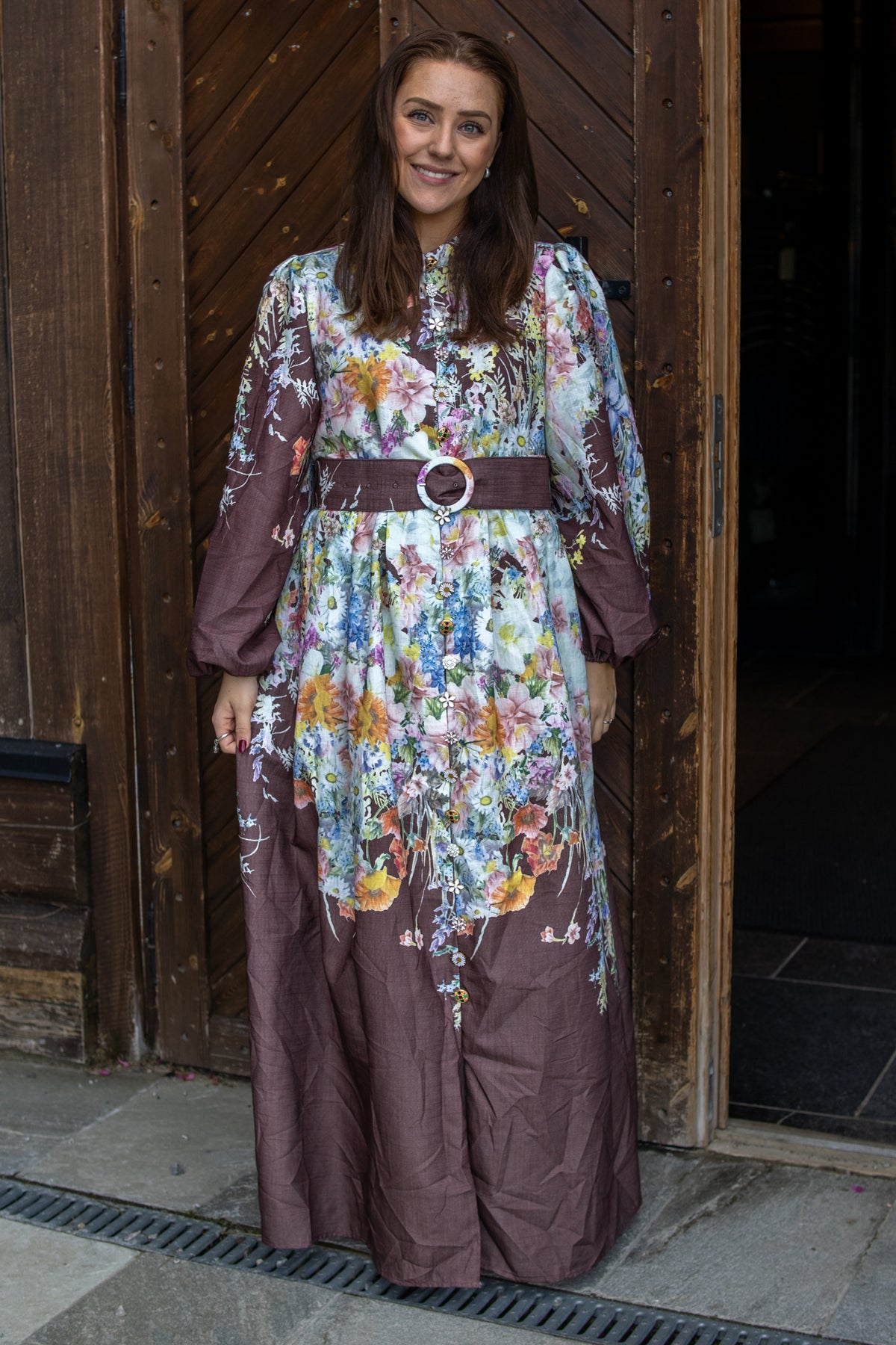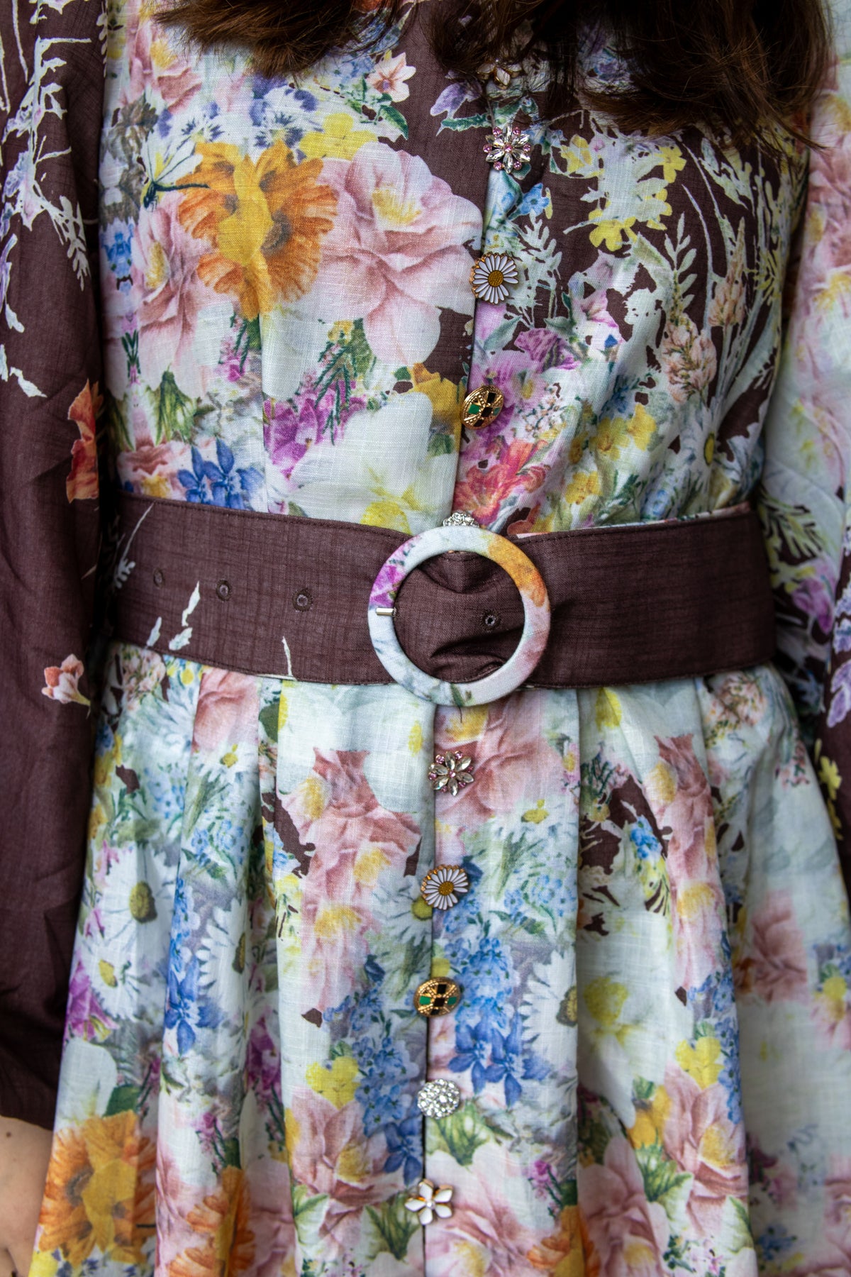 Kjolen lukkes med vakre knapper og belte som komplimenterer midjen.