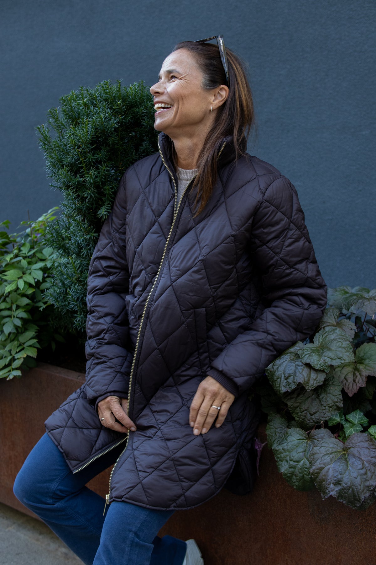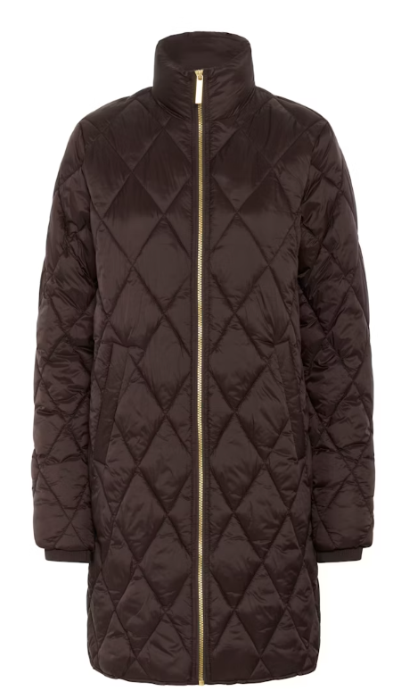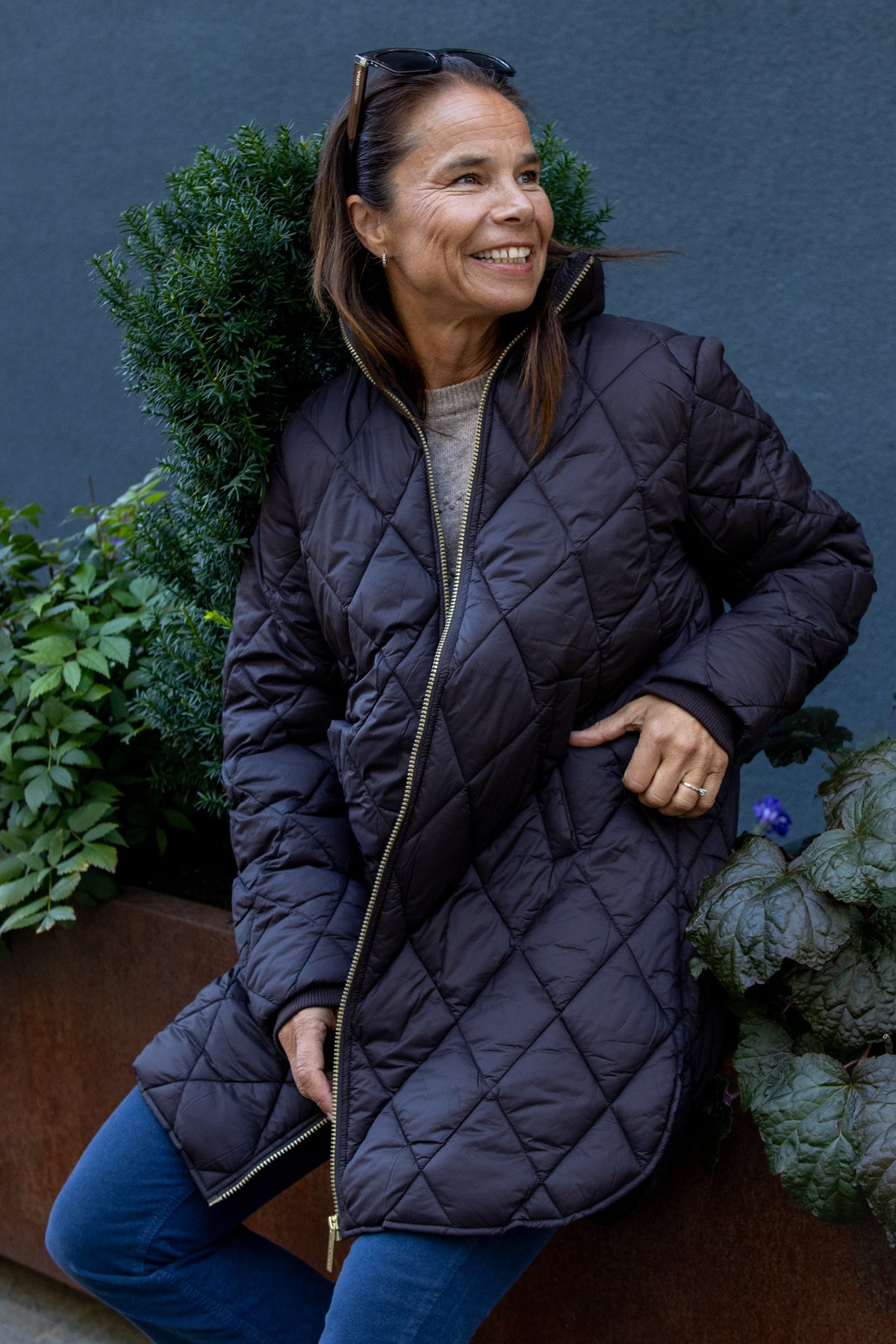 Denne lange jakken har et klassisk diamantquiltet mønster og en høy krage som skjermer godt mot vind og kulde. Den glatte overflaten og detaljer i gull, som glidelåsen, tilfører et moderne og elegant preg. Perfekt i overgangssesongen – både praktisk og stilig på samme tid.