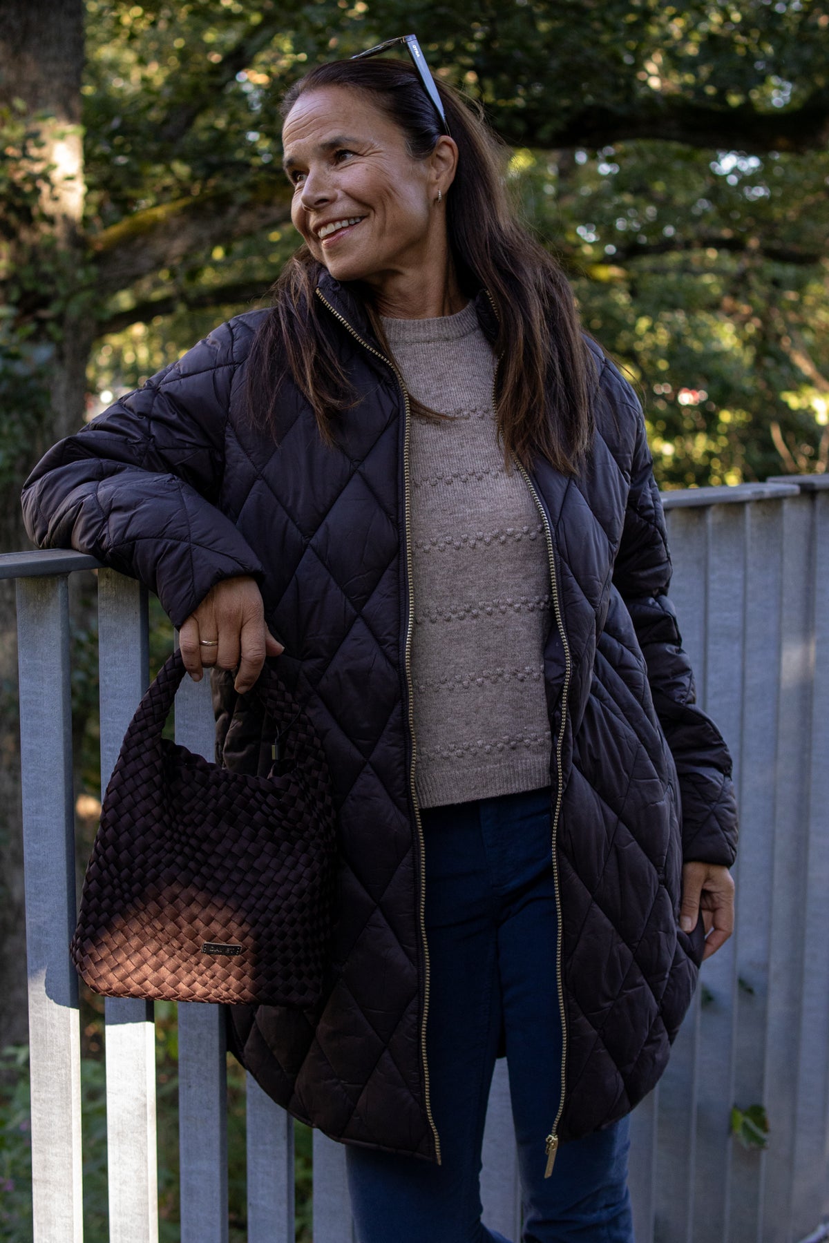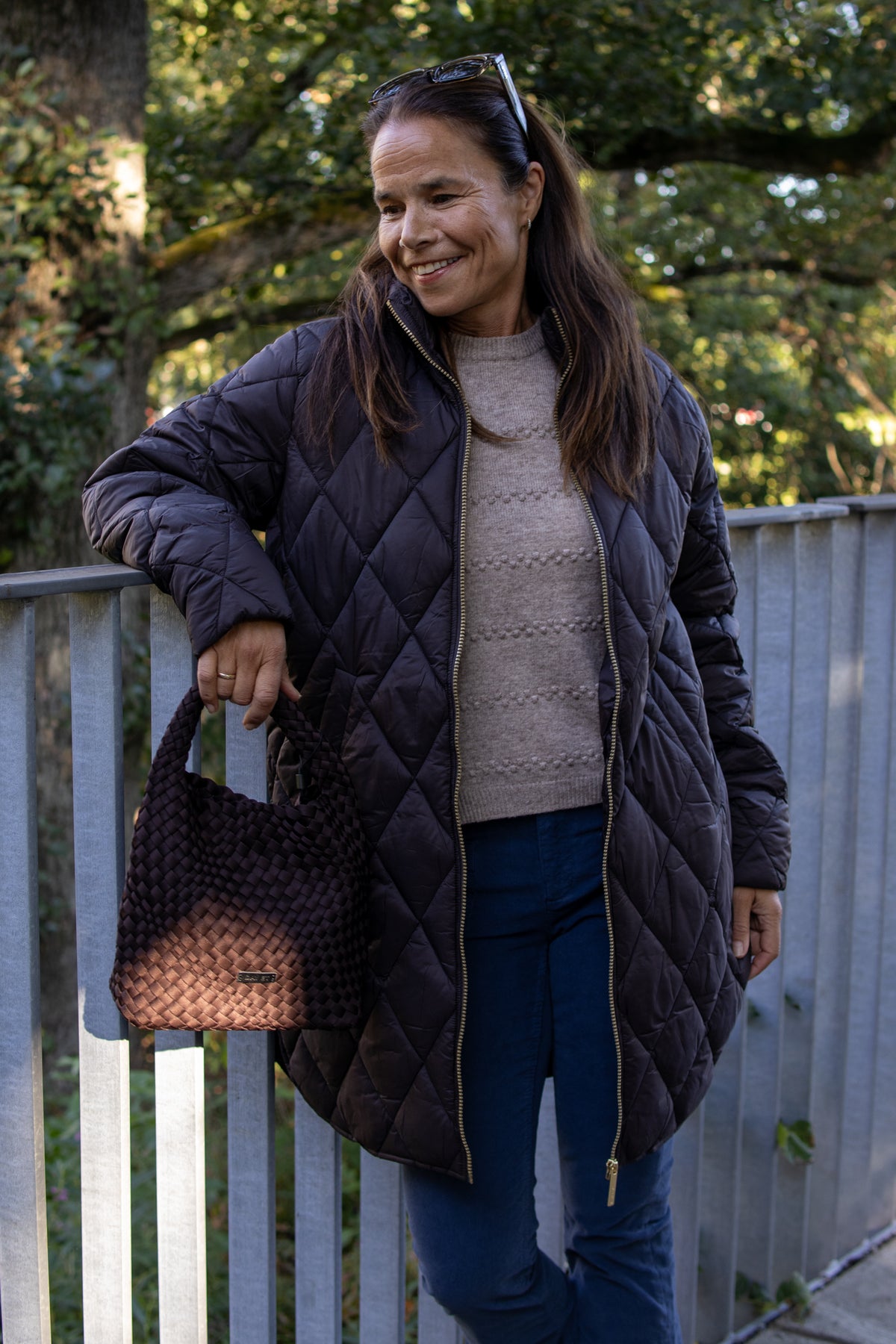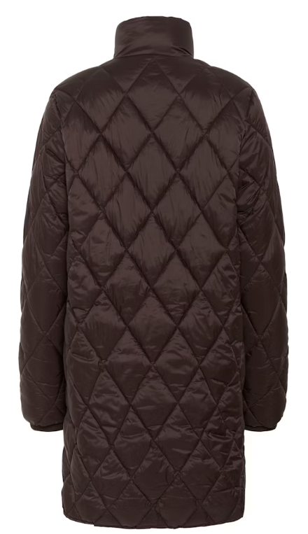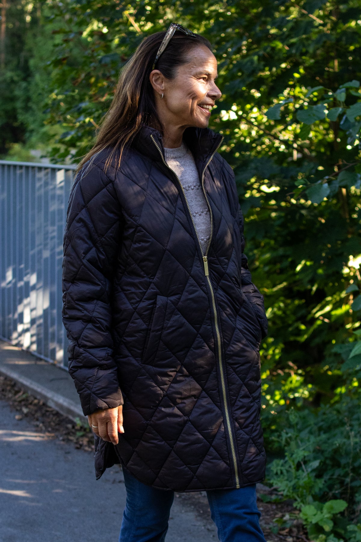 Denne lange jakken har et klassisk diamantquiltet mønster og en høy krage som skjermer godt mot vind og kulde. Den glatte overflaten og detaljer i gull, som glidelåsen, tilfører et moderne og elegant preg. Perfekt i overgangssesongen – både praktisk og stilig på samme tid.