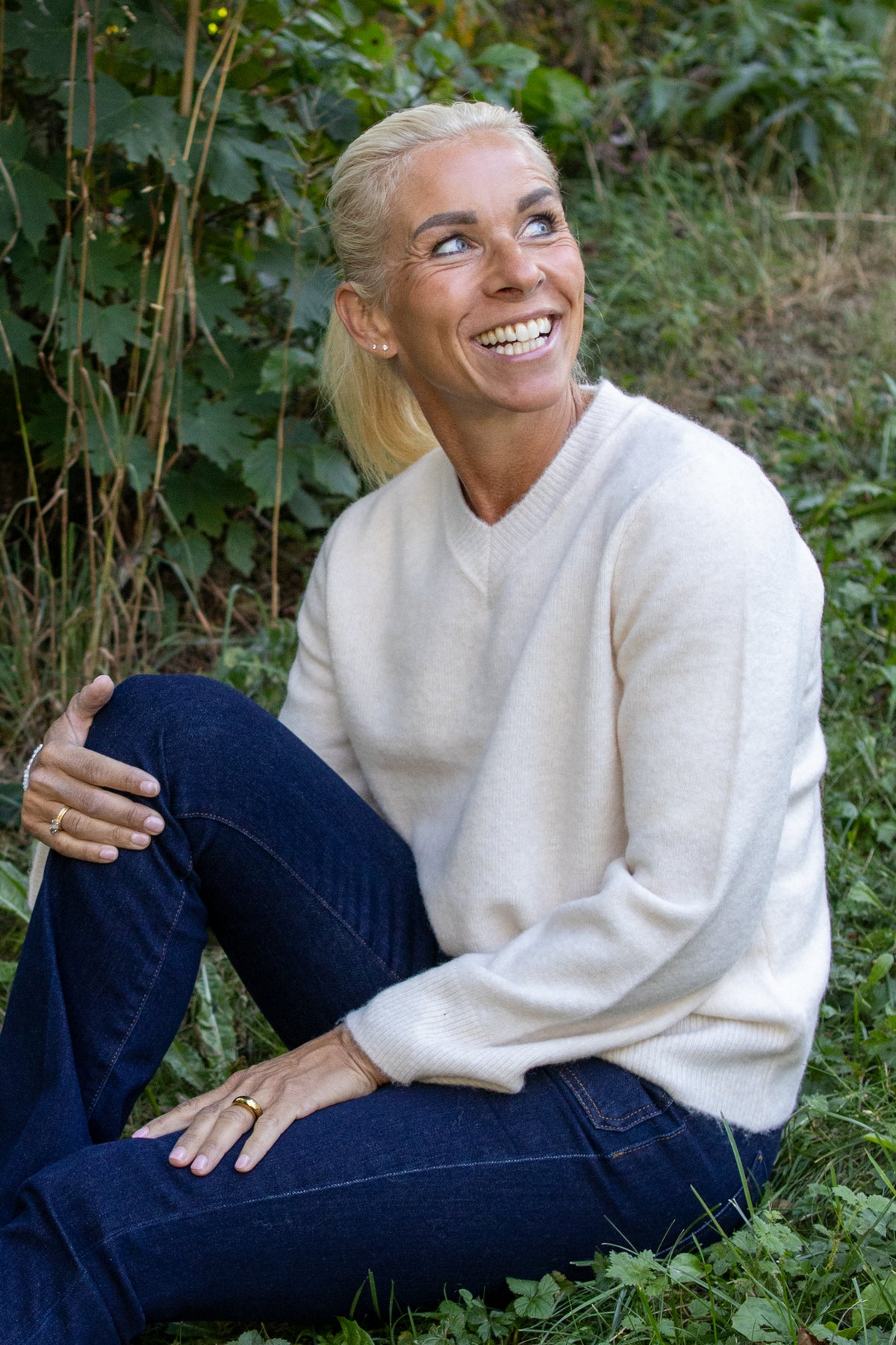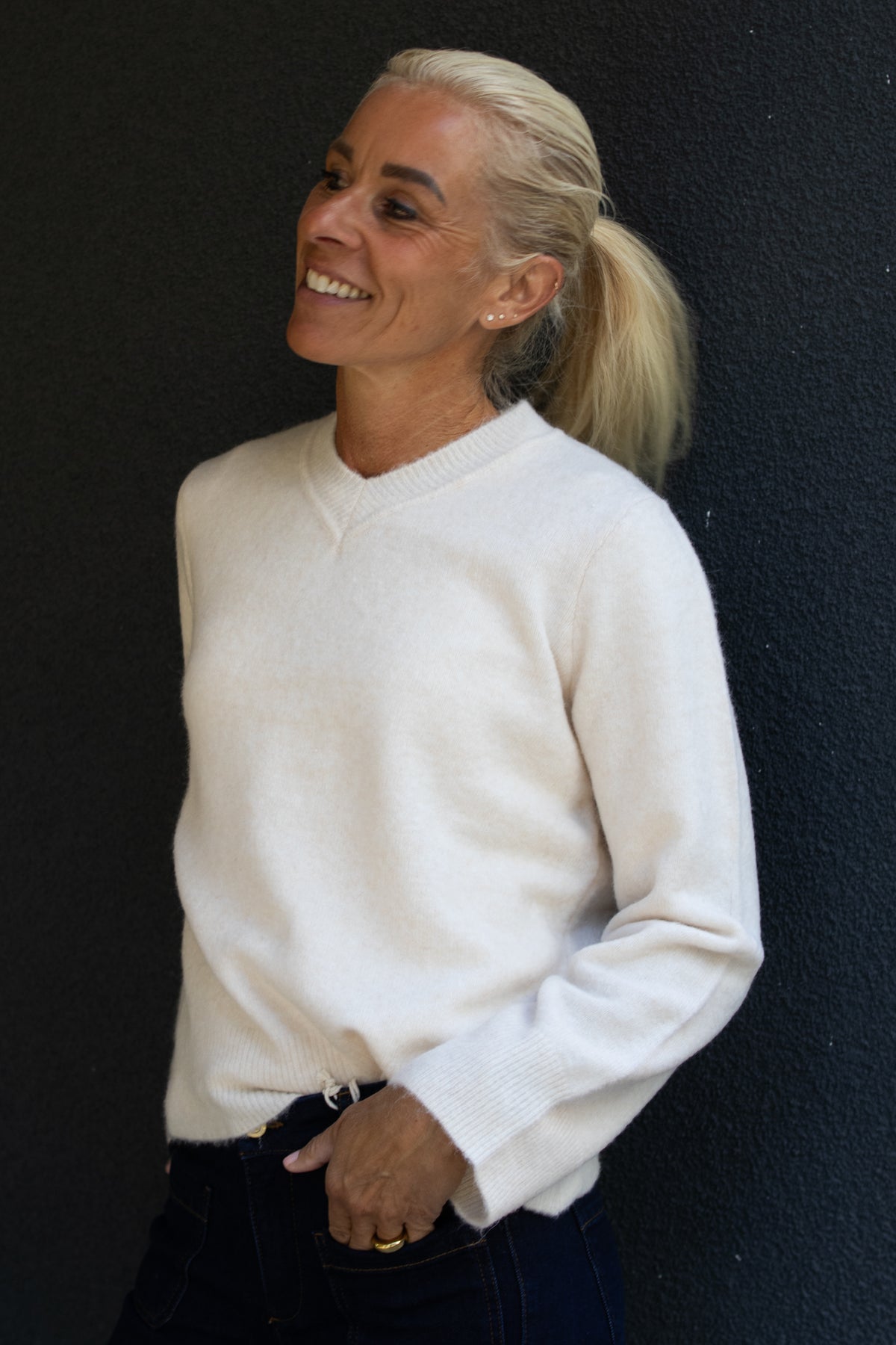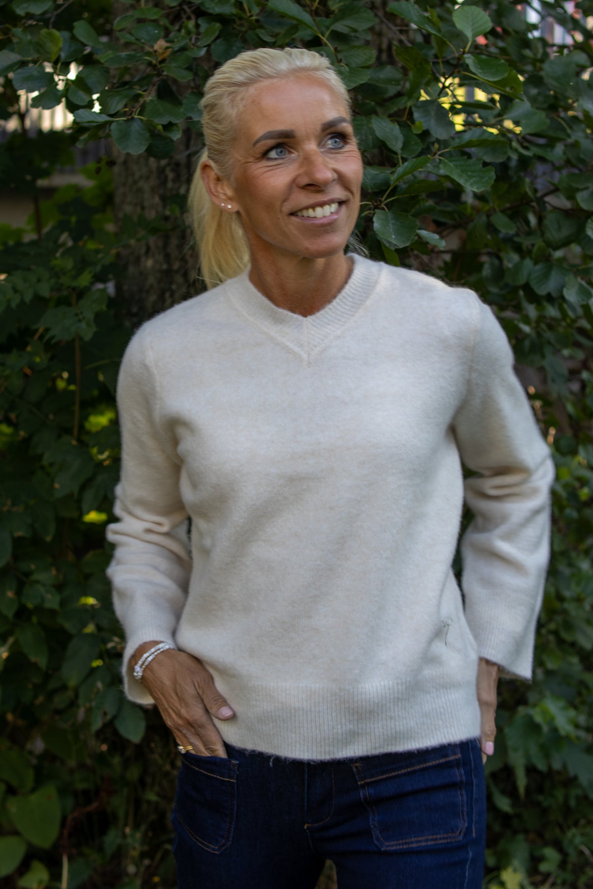 "Guni V-neck - Whisper White Melange" fra Inwear er en enkel og komfortabel genser. Genseren har rett passform. Perfekt til jeans.