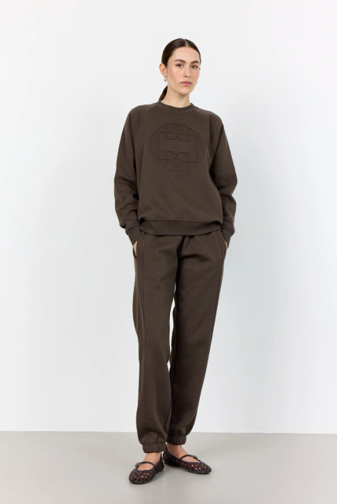 Genseren har rund hals, lange ermer og et strukturert, sirkulært logodesign foran.