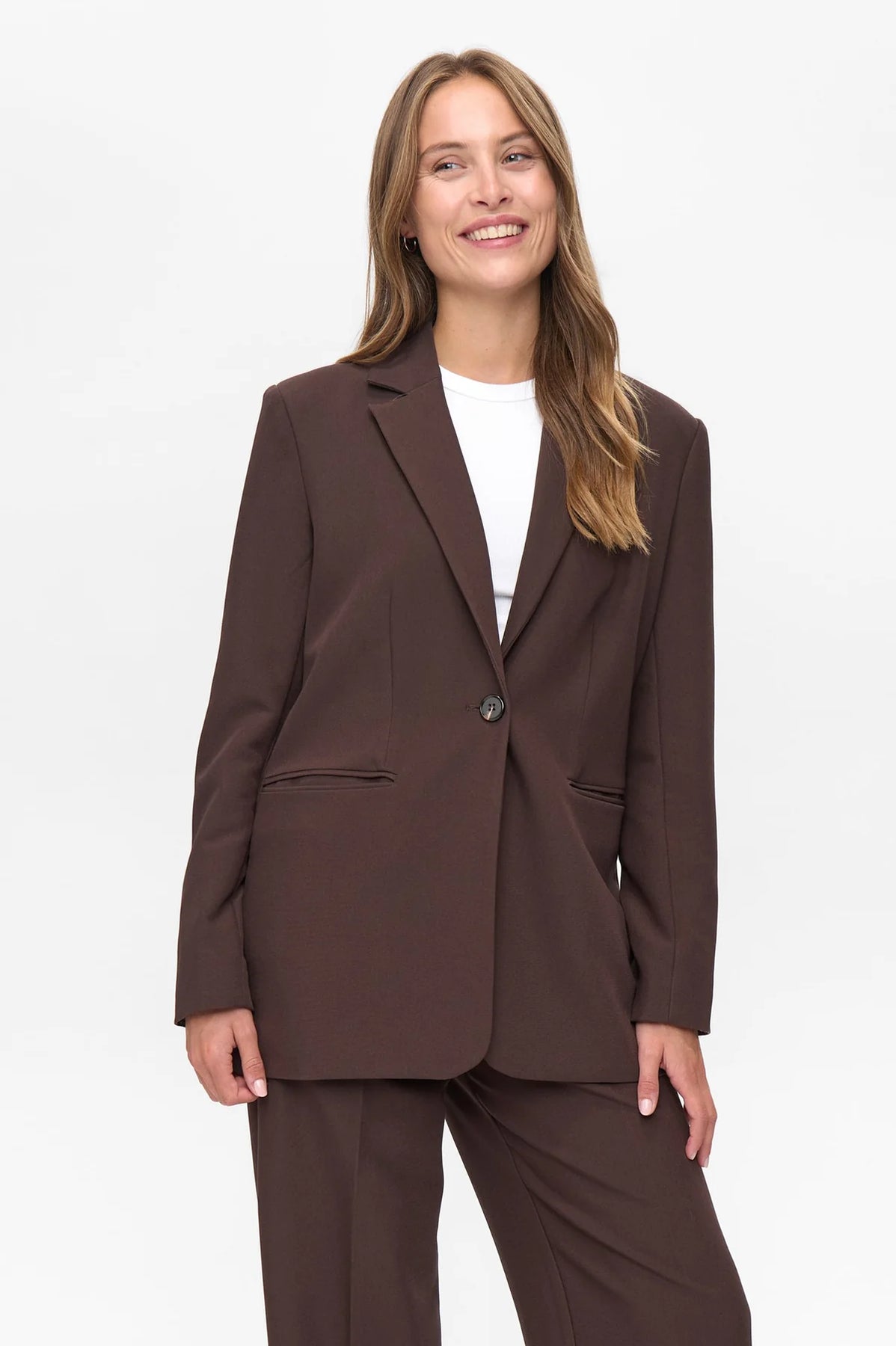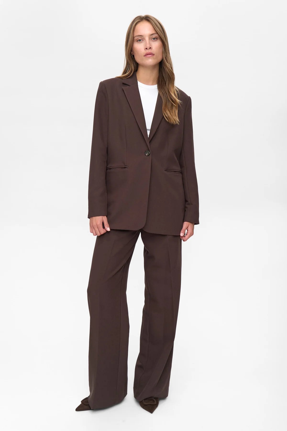Bussy Blazer fra Nümph er kul og klassisk i en nydelig brun farge. Blazeren er oversized, gå gjerne ned om du ønsker den mer kroppsnær.