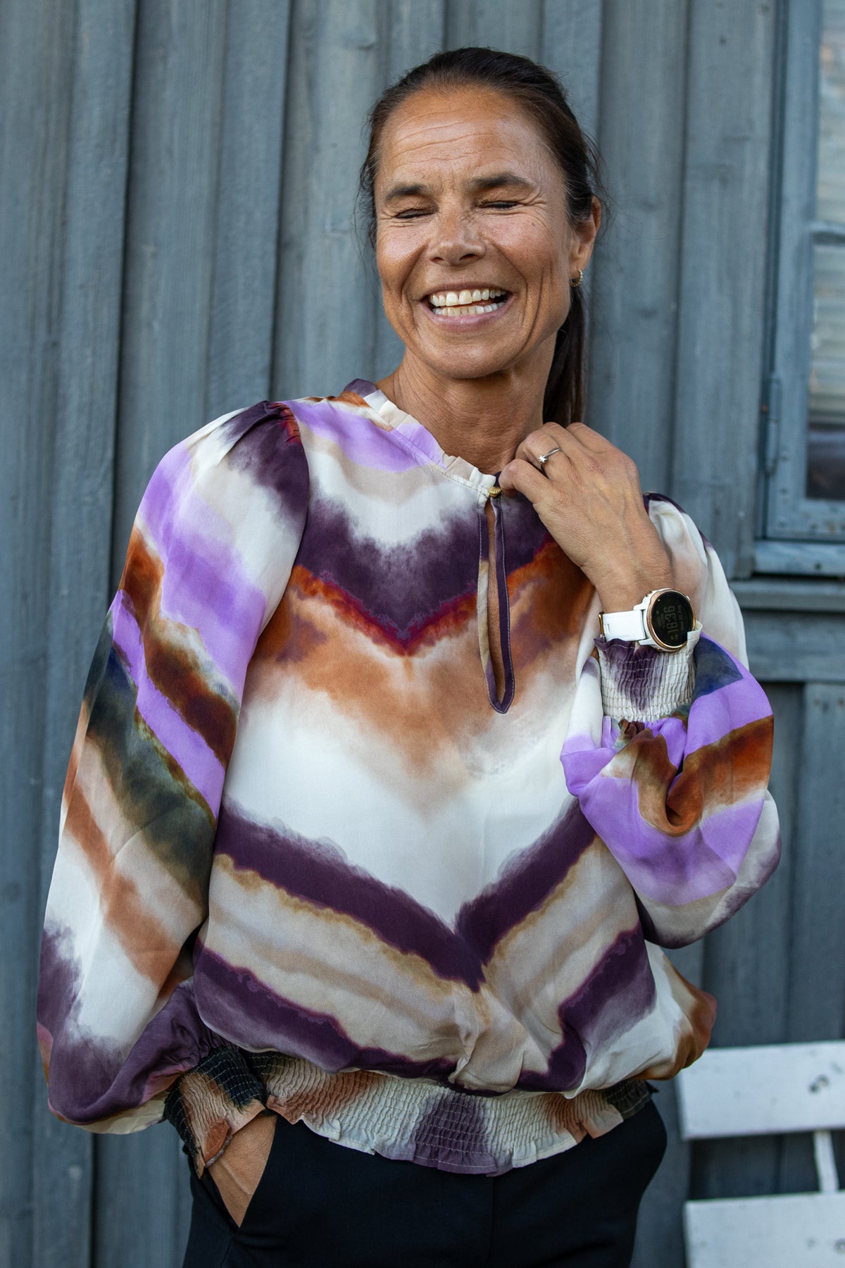Superfin bluse i nydelig kvalitet. Føles som silke. Unikt mønster i zigzag. Strikk nederst på armene og bolen som gjør at blusen sitter ekstra fint på.