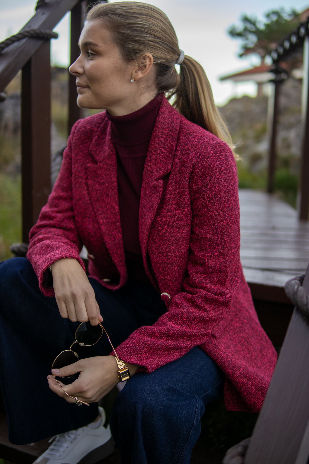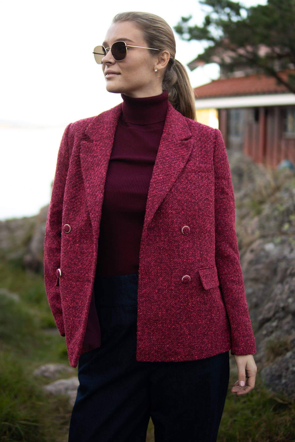 En klassisk blazer med moderne detaljer – perfekt for å løfte ethvert antrekk. Den er laget i slitesterkt polyesterstoff og har en dobbeltspent lukking foran. Med frontlommer, splitt bak og en vendbar krage kombinerer den tidløs skreddersøm med et friskt uttrykk. Bruk den alene for en sofistikert look, eller kombiner med matchende bukser for en hel dress i en spennende farge eller print.