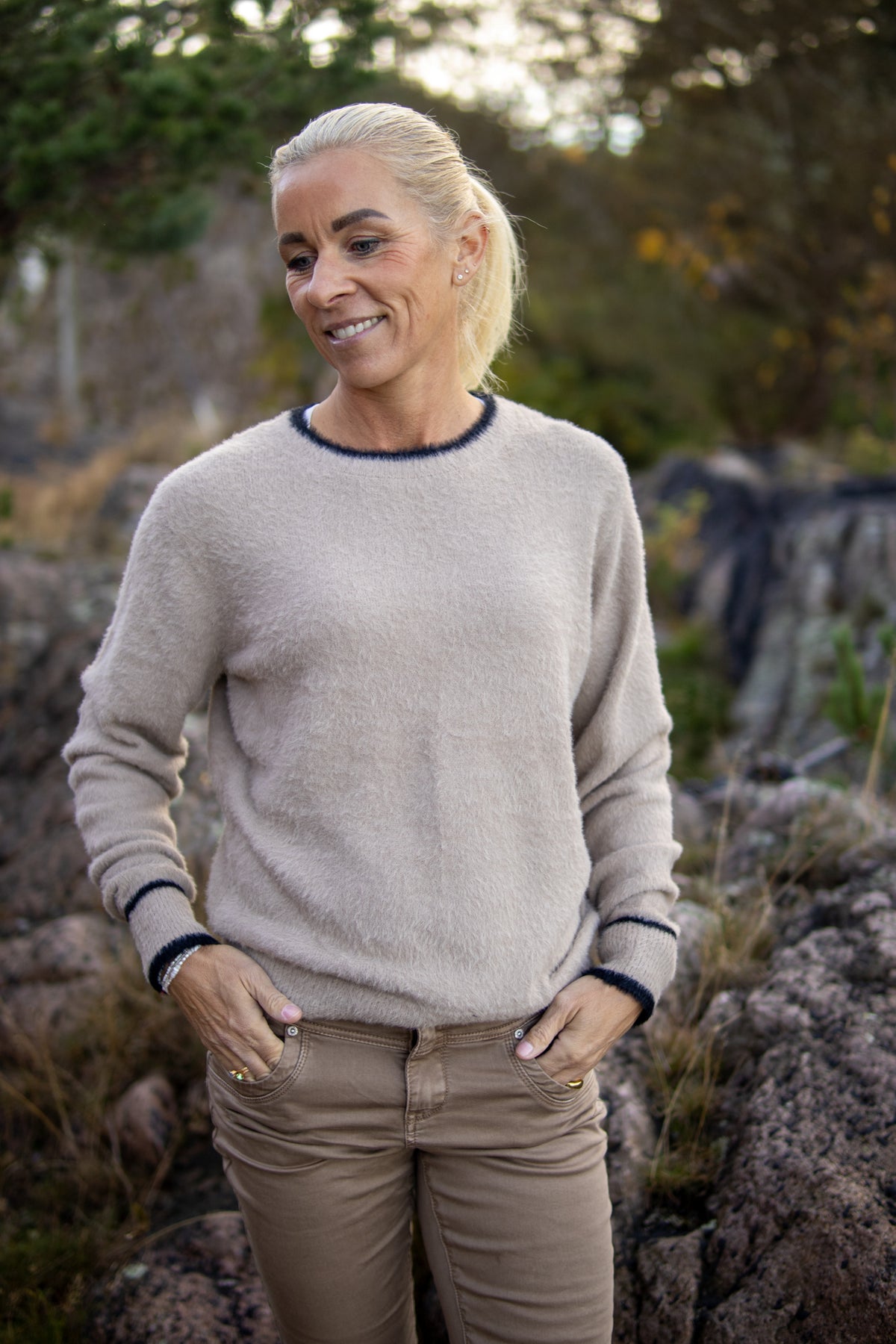 Myk og lun «Fluffy Sweater» fra Red Button i en varm camel/karamellfarget tone. Genseren har et tidløst, rett snitt med rund hals og lange ermer. Det fluffy materialet gir en behagelig og trendy look – perfekt til både hverdag og jobb.