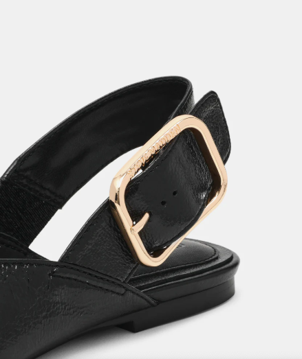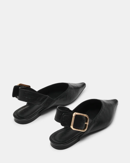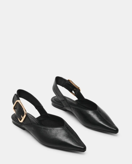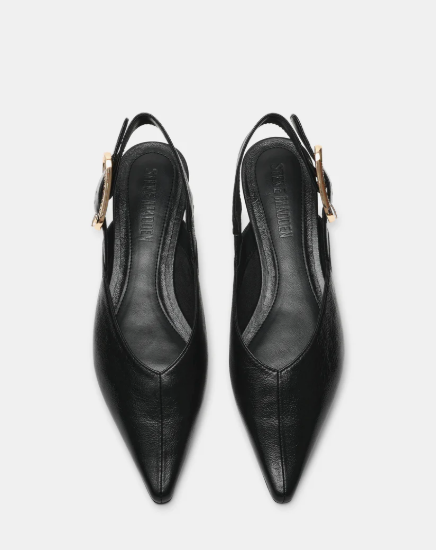 Sianna fra Steve Madden er en elegant og moderne slingback-sko i sort skinn med spiss tå. Den har lav hæl på 1,5 cm og en bred gullspenne som gir både støtte og stil. Perfekt til jobbantrekk, kjoler eller dressede looks – en sko som holder deg komfortabel og chic hele dagen.
