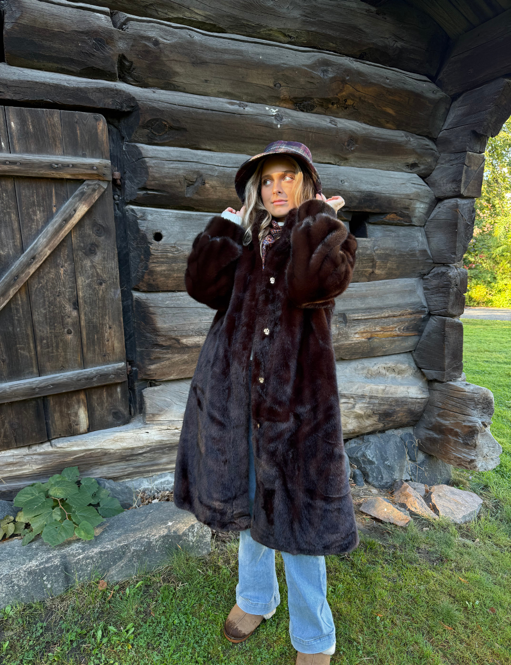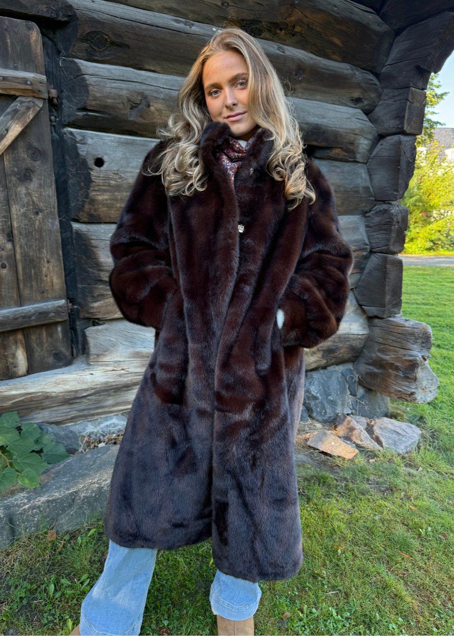 Oppdag vinterens nye luksusfavoritt – en lang fuskepelskåpe i dyp minkbrun med vakre sjatteringer som gir liv og glans til stoffet. Innsiden er kledd i myk pels som gjør at ermene enkelt kan brettes opp uten å miste det sofistikerte uttrykket. Diskrete trykknapper gir en ren og tidløs silhuett, samtidig som kåpen holder deg varm og velstelt gjennom hele sesongen. Et stilsikkert valg både til hverdag og fest.