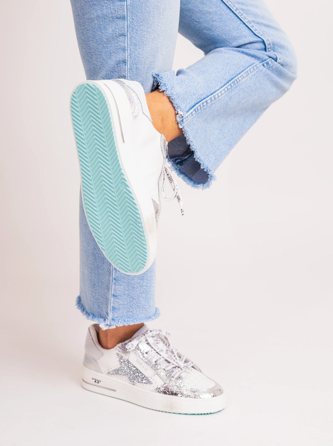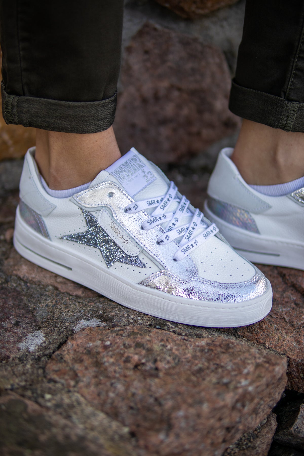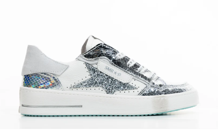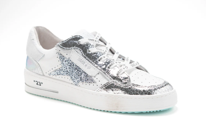 Modellen kombinerer sølvfarget skinn med krakelert tekstur, turkis såle, glitrende detaljer og en skimrende, holografisk hæl – en dristig miks som gir skoen en sterk visuell identitet. På siden pryder en glitrende stjerne som et selvsikkert statement – en liten detalj med stor effekt.