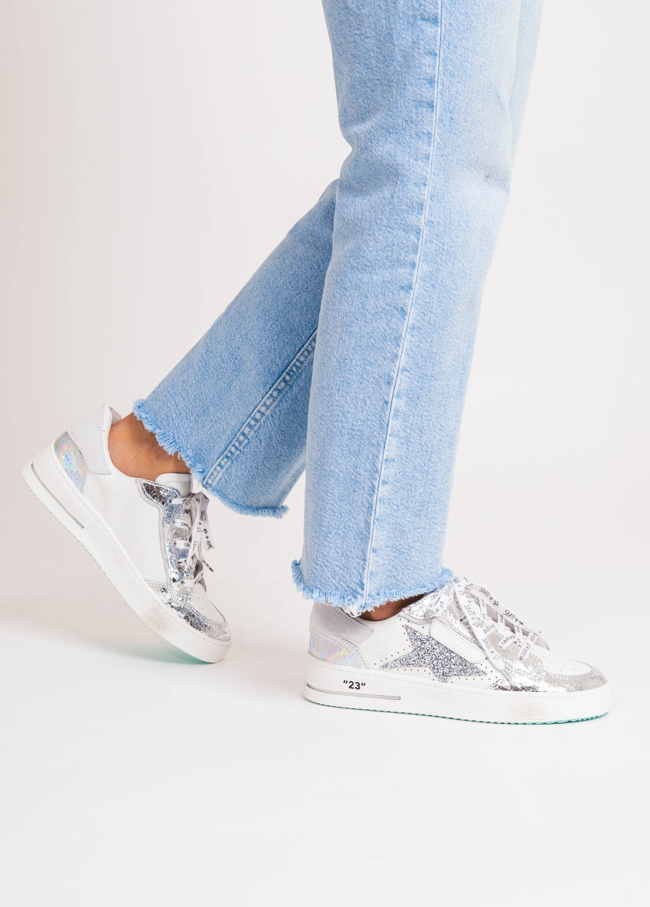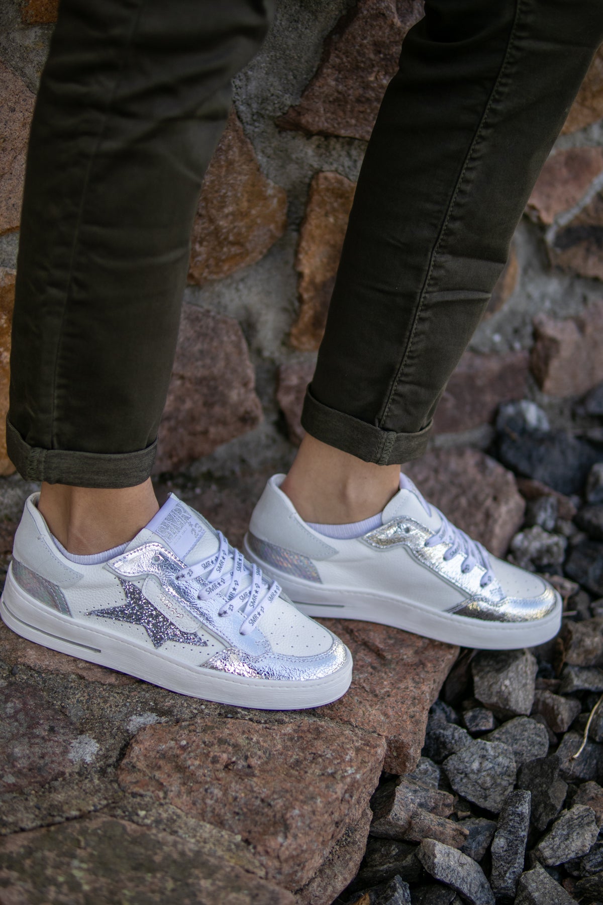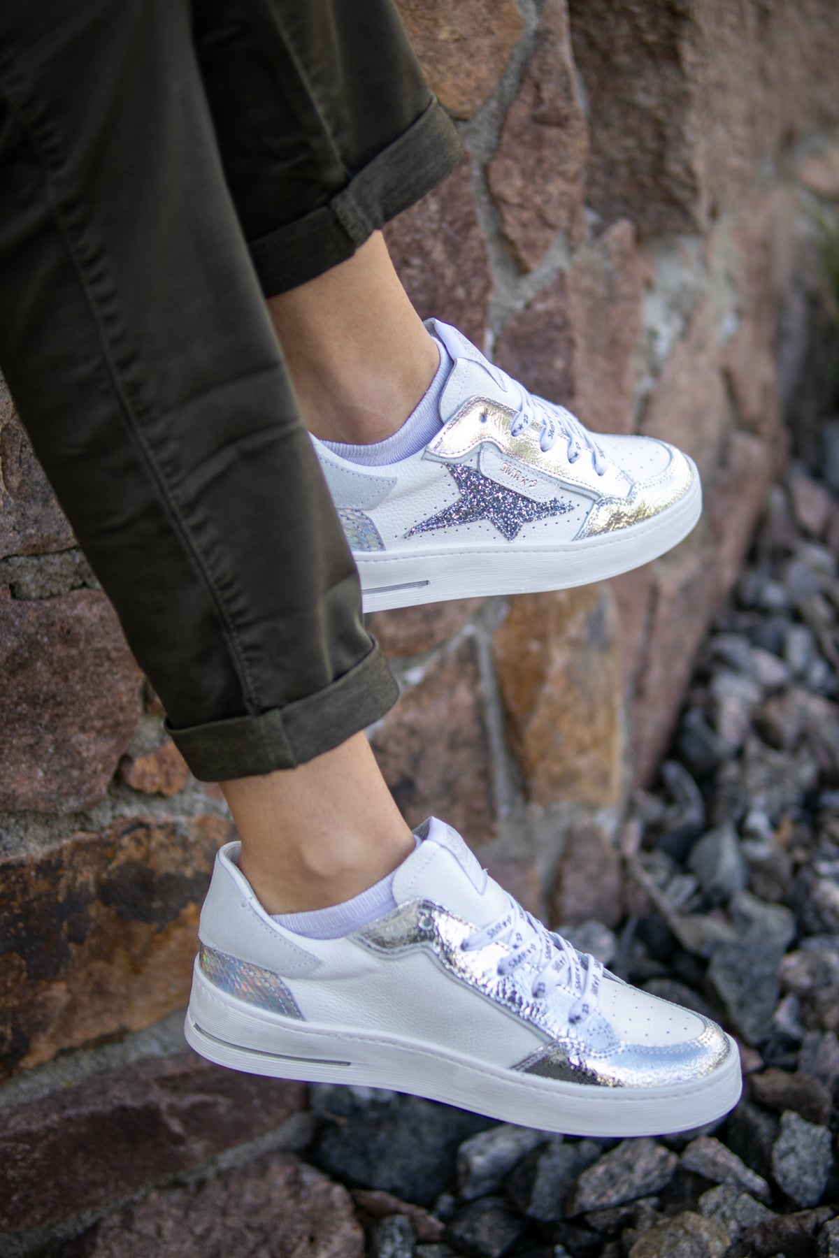 Modellen kombinerer sølvfarget skinn med krakelert tekstur, turkis såle, glitrende detaljer og en skimrende, holografisk hæl – en dristig miks som gir skoen en sterk visuell identitet. På siden pryder en glitrende stjerne som et selvsikkert statement – en liten detalj med stor effekt.