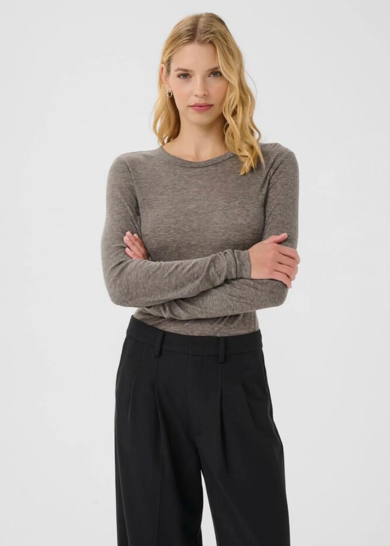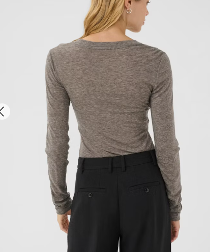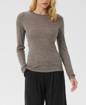 Tinniesi T-shirt fra Part Two er en langermet T-skjorte laget i en myk og elastisk ullblanding som sitter tett inntil kroppen uten å føles stram. Materialet føles behagelig mot huden og gir god bevegelsesfrihet, samtidig som det gir ekstra varme på kjøligere dager. Den har en klassisk, rund hals og et tidløst uttrykk, noe som gjør den svært enkel å style. Bruk den alene for en ren og minimalistisk look, eller som et komfortabelt og isolerende lag under skjorter, blazere eller strikk. Et praktisk basisplagg som passer like godt til hverdags som på kontoret.
