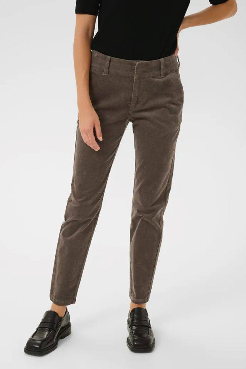 Soffysa Pants i Falcon fra Part Two er en klassisk chinos-bukse i myk, brun kordfløyel. Den har ankellengde, smale ben og en mid-waist passform som gir en tidløs og flatterende silhuett. Buksen har stikklommer i sidene, dekorative lommer bak og lukkes med hempe og skjult glidelås foran. Den brede linningen og den gode stretchen gir en behagelig passform som sitter godt gjennom hele dagen.