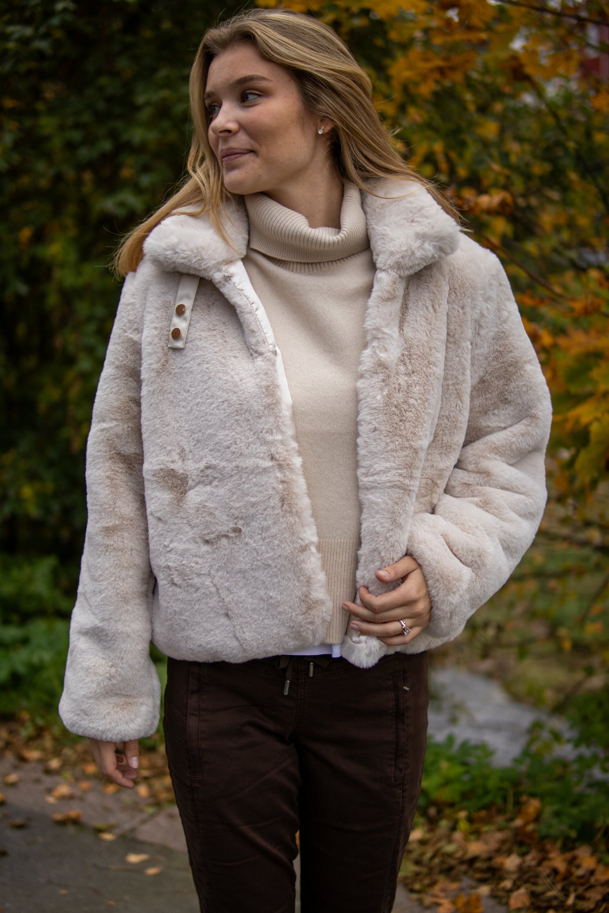 Nuwinda Jacket fra Nümph er en lekker og supermyk fuskepelsjakke i en nydelig off-white farge. Jakken har en feminin og elegant stil, med hemper foran som fungerer som lukkemekanisme. Kragen kan lukkes med en dekorativ knappeløsning, der et stoffbånd tres gjennom en gullfarget ring og festes med to lekre gull trykknapper – en fin og praktisk detalj som gir jakken det lille ekstra. Jakken har stikklommer i sidene. Den passer perfekt til både hverdagsbruk og penere anledninger når du vil føle deg varm, velkledd og stilfull.