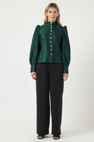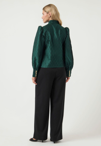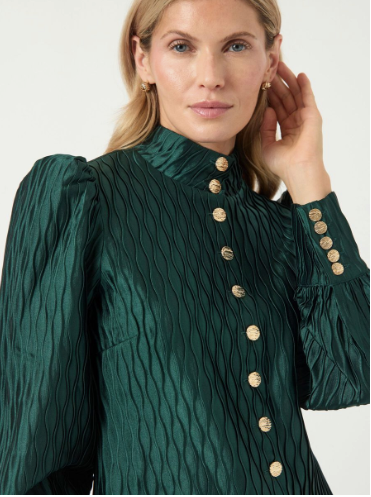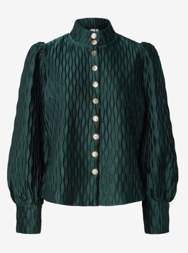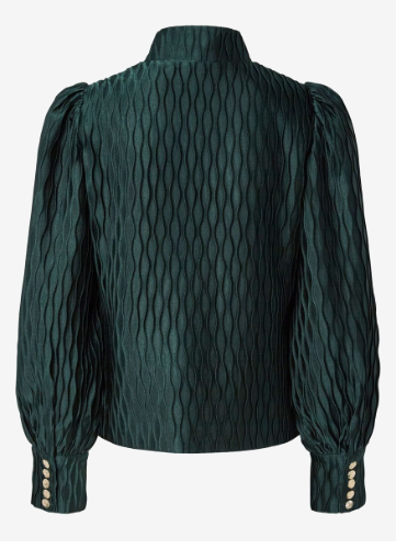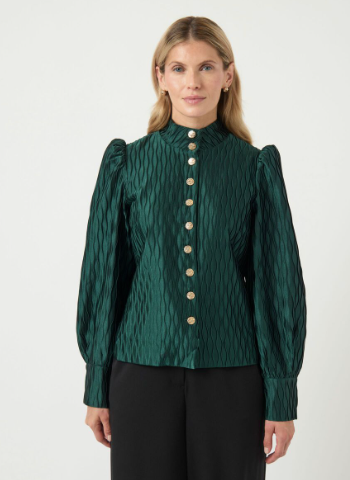 Denne høyhalsede jacquard-skjorten kombinerer klassisk eleganse med moderne detaljer. Den er designet i et glansfullt stoff som gir et sofistikert uttrykk og gjør plagget ideelt både til hverdags og festlige anledninger. Skjorten lukkes foran med dekorative metallknapper som tilfører et eksklusivt preg, mens de lange ballongermene skaper volum og bevegelse. Mansjettene er pyntet med stablede knapper som setter prikken over i-en. Med en normal passform og lett, behagelig kvalitet i 100 % polyester, er dette en skjorte som både føles komfortabel og ser stilfull ut.