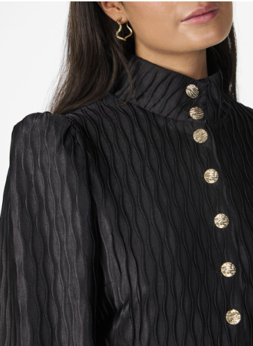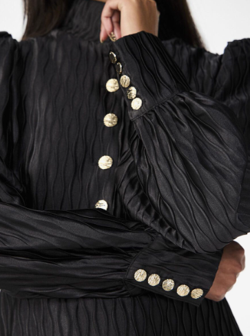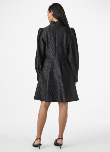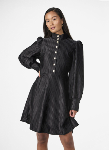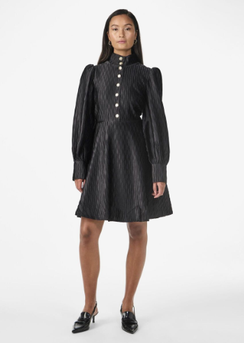Denne høyhalsede minikjolen i jacquard gir et elegant og moderne uttrykk, perfekt til både fest og spesielle anledninger. Den er laget i et skinnende stoff som reflekterer lyset og tilfører et sofistikert preg. Kjolen har lange ballongermene med stablede knapper i mansjettene som gir en feminin og detaljrik finish. Foran finner du en halv knappelist med dekorative metallknapper, mens glidelåslukkingen bak gjør den enkel å ta av og på. Snittlinjen i midjen fremhever silhuetten, og den korte lengden skaper en balansert kontrast mellom klassisk design og moderne stil. Passformen er normal, og modellen har på seg størrelse M. Materialet består av 100 % polyester, som gir både struktur og komfort.