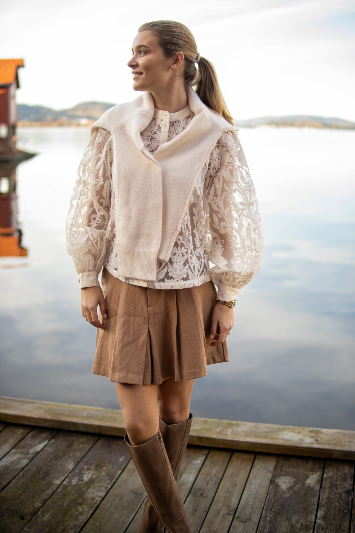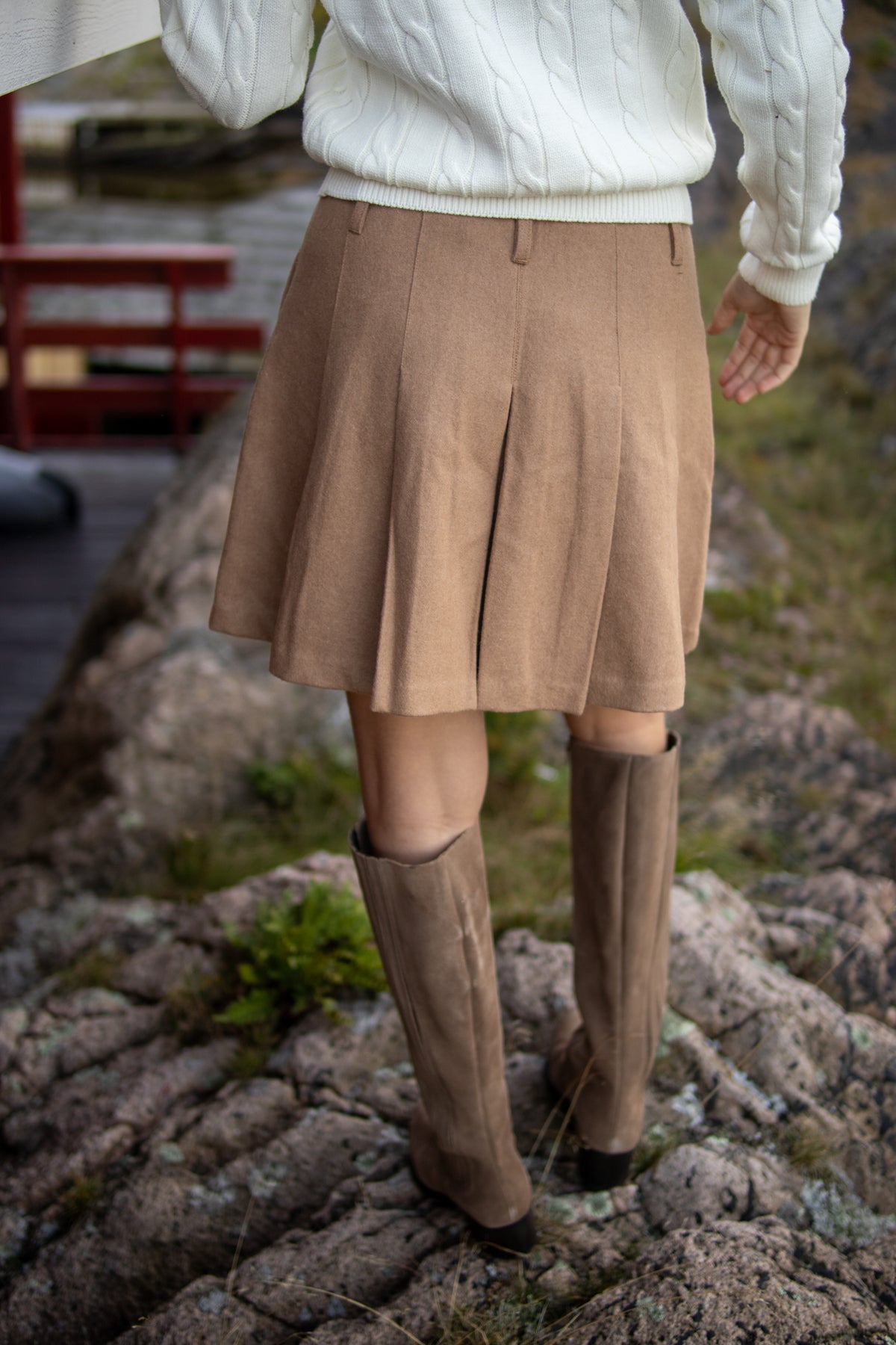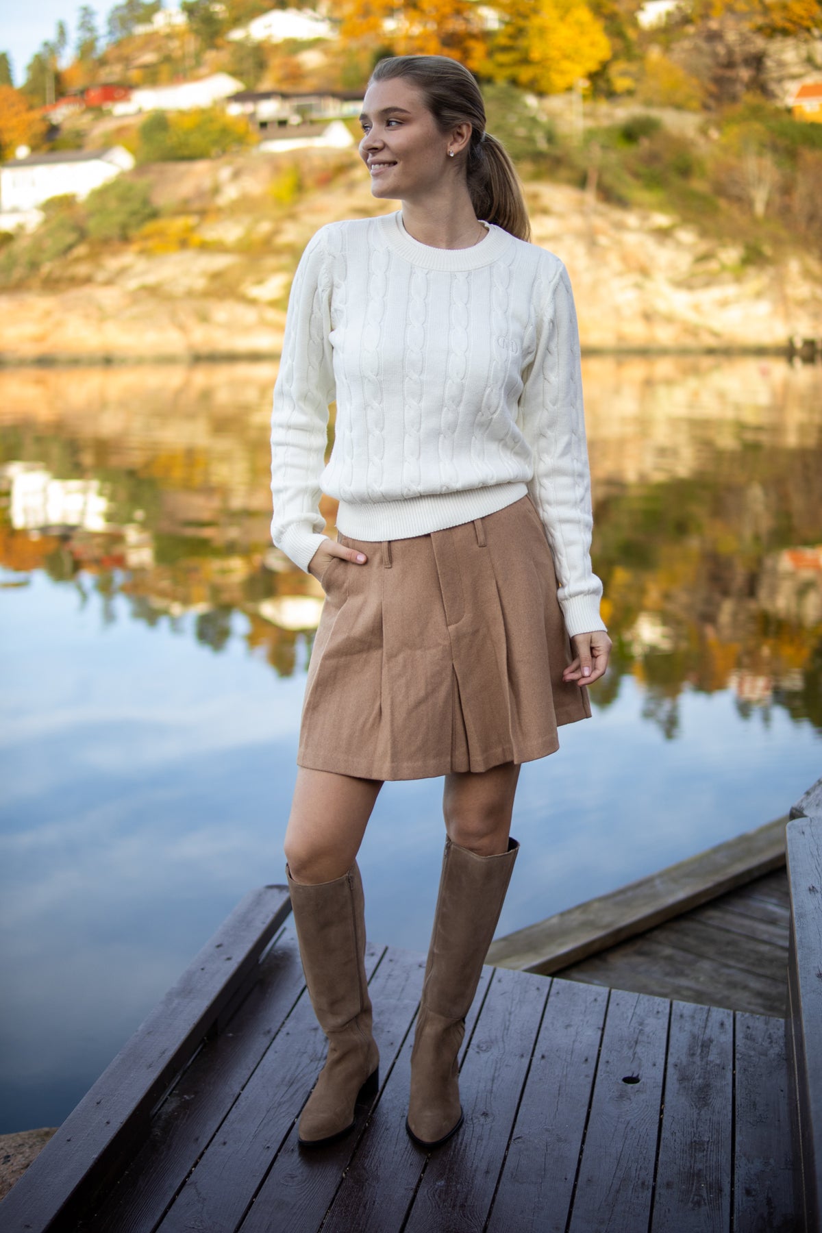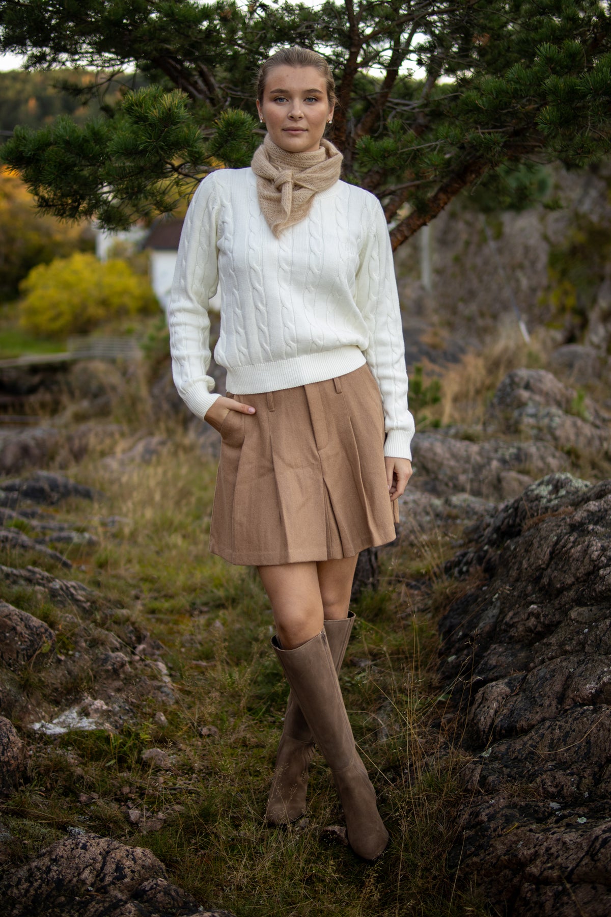 School 25 Wool Skirt er et strukturert ullskjørt med markerte folder som gir et elegant og moderne uttrykk. Skjørtet har sidelommer, beltehemper og glidelåslukking foran som fremhever det stilrene designet. Med sin tidløse passform og rene linjer er det enkelt å style både med strikkegensere og skjorter – perfekt til både hverdag og mer pyntede anledninger.