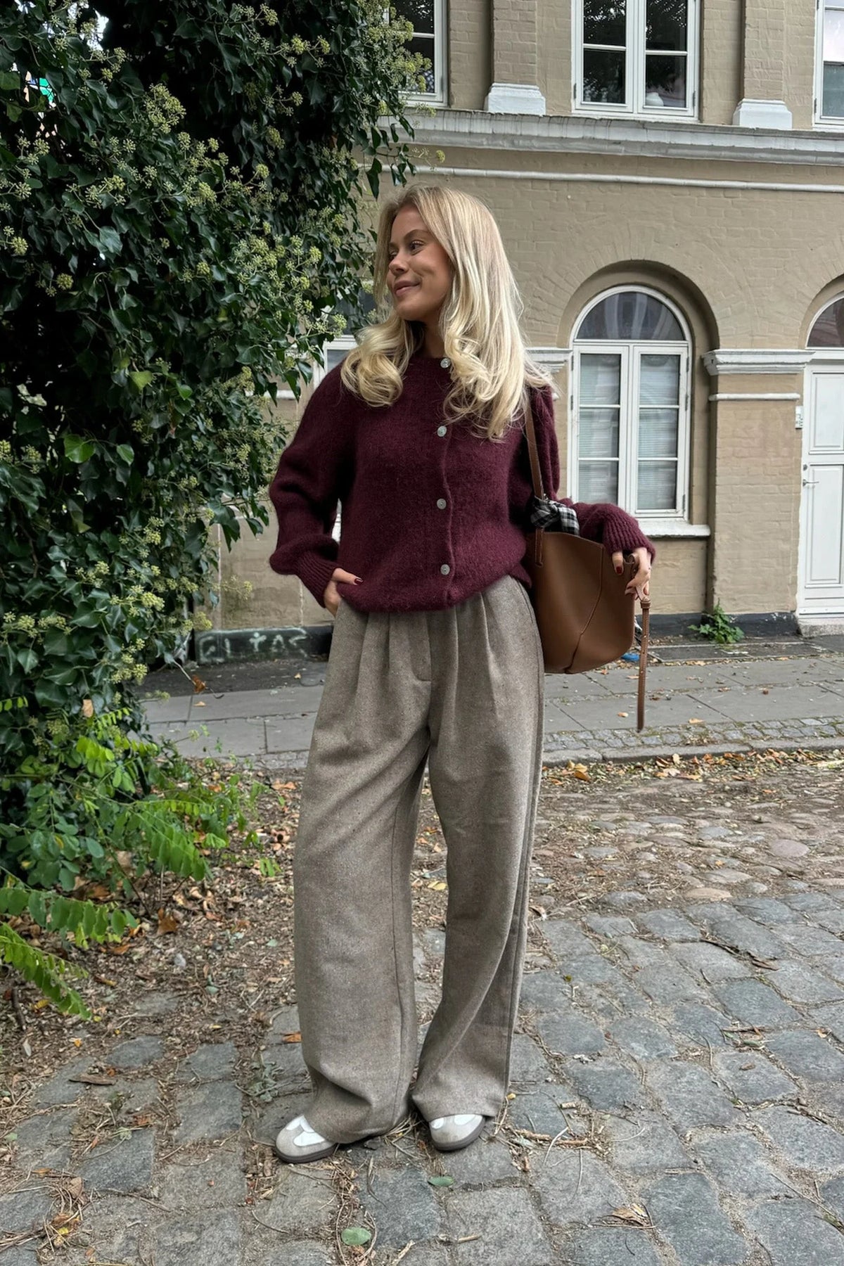 "Ida Cardigan - Bordeaux" er en nydelig cardigan fra ByIC. Den er i en fussy mohair blanding med lange volumiøse ermer. Den lukkes i front med lekre perlemorsknapper.