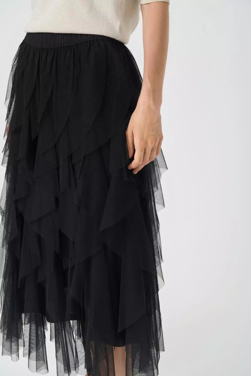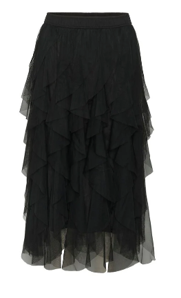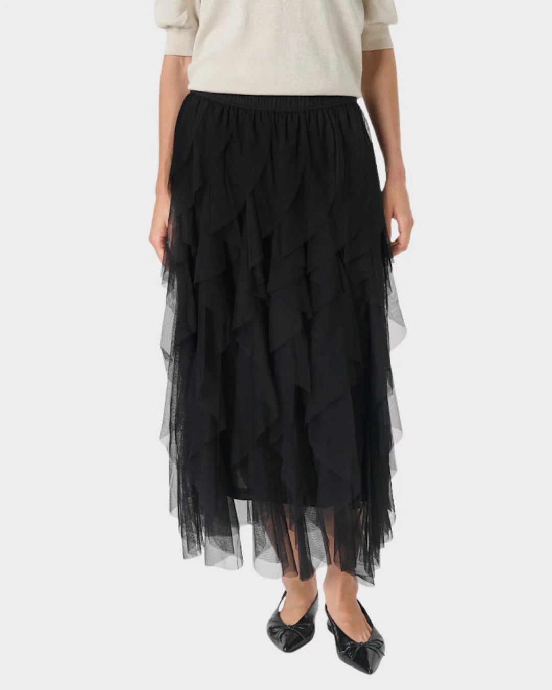 Svanhild skjørtet fra Part Two er et tidløst midiskjørt i sort tyll, designet med delikate, lagvise volanger som gir et luftig og feminint preg. Skjørtet har en myk, elastisk linning som sørger for komfort gjennom hele dagen, og det lette stoffet beveger seg elegant med hvert steg. Et allsidig plagg som kan styles opp eller ned – bruk det med en chunky genser og støvletter for en moderne hverdagslook, eller sammen med en silkebluse og hæler når du vil skape et mer raffinert uttrykk.