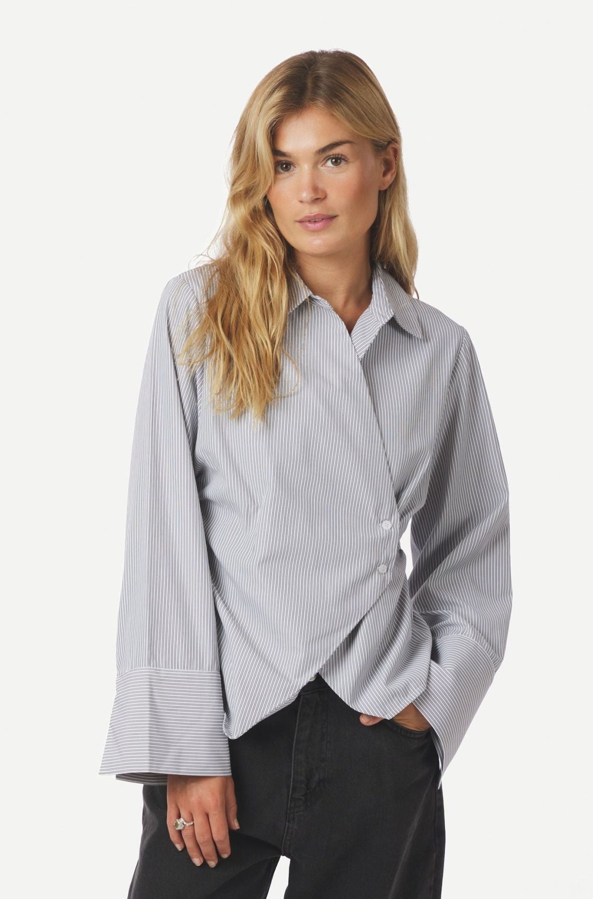 Fenli Striped Shirt fra Neo Noir. Den klassiske stripete skjorten, med en moderne og cool tvist. Fenli Striped Shirt har lange, vide ermer og klassisk skjortekrage. Skjorten har omslagseffekt foran med knappelukking.