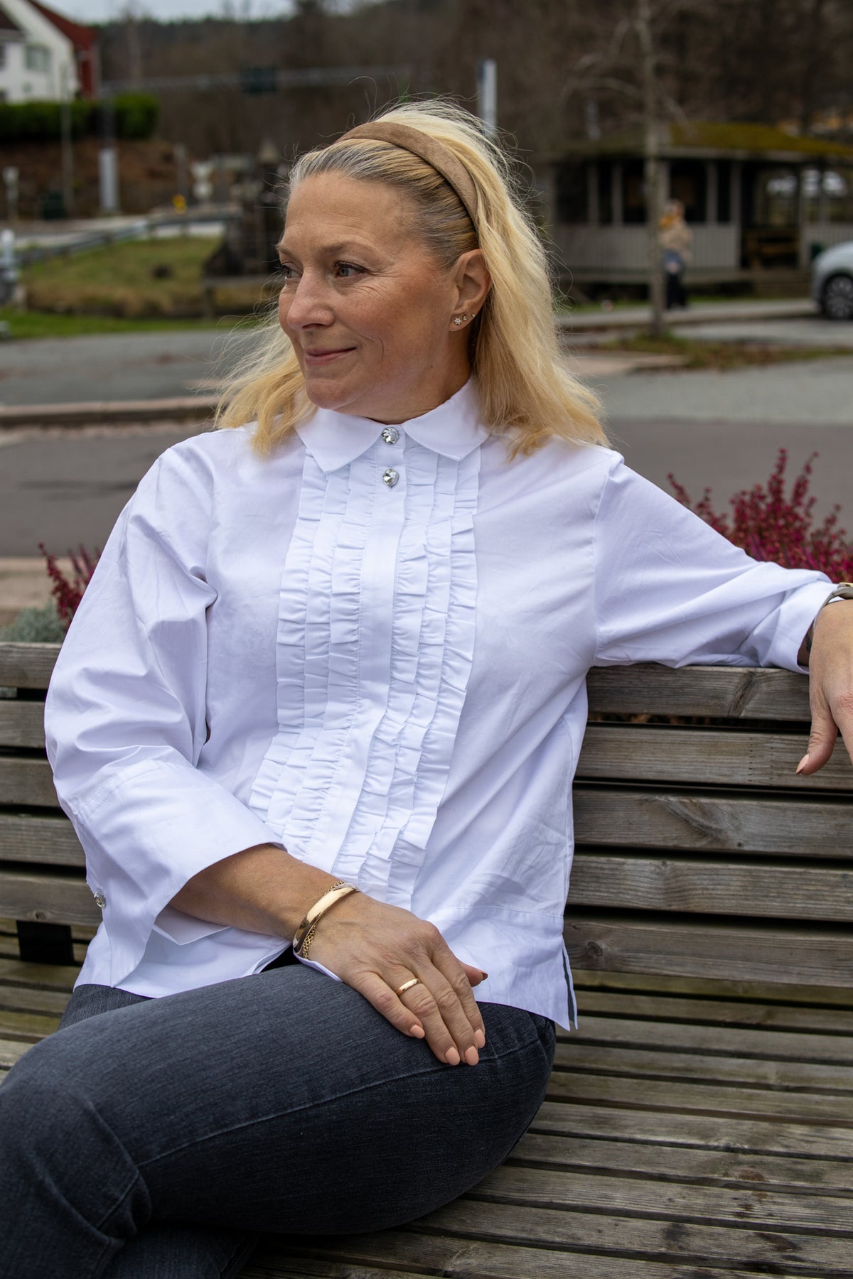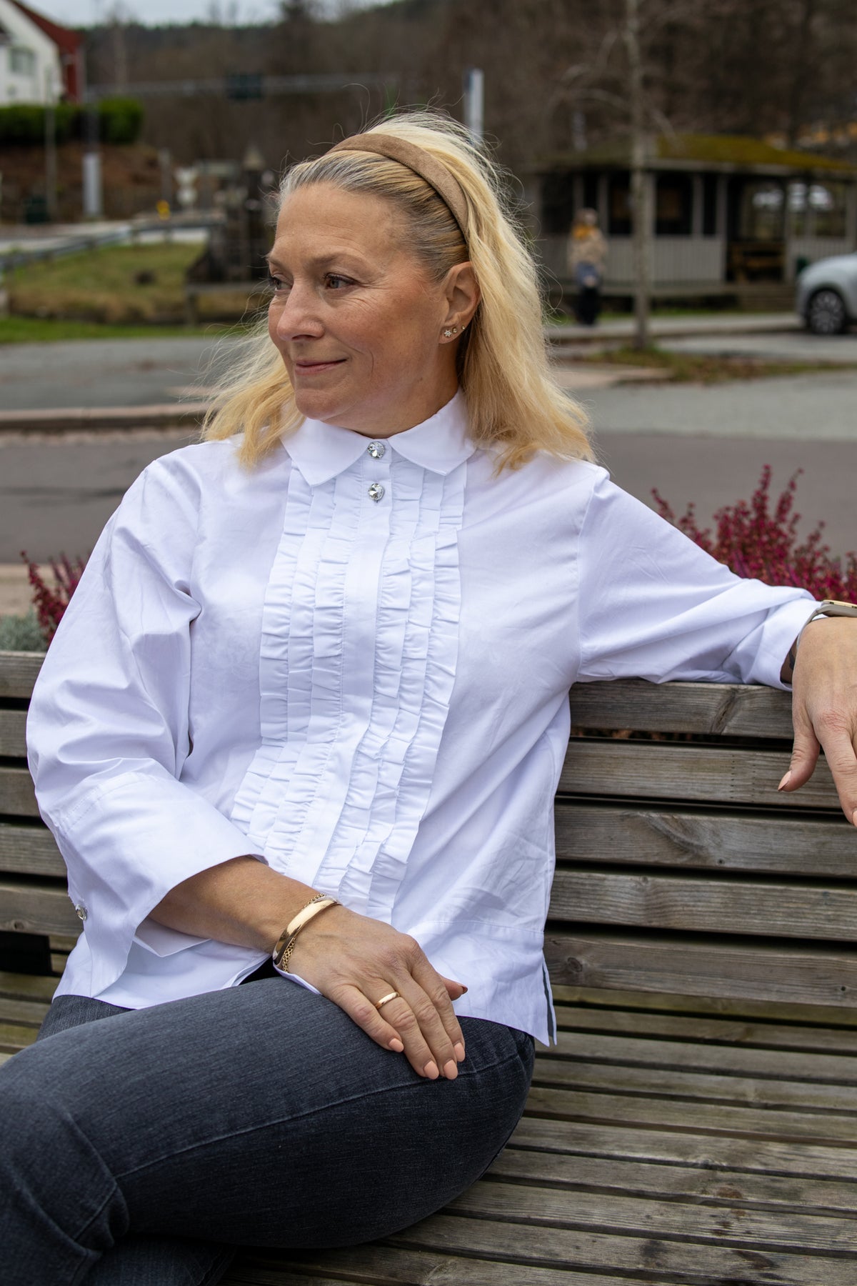 Denne elegante hvite skjorten fra Part Two er laget i et glatt, økologisk bomullsstoff som gir et sofistikert uttrykk. Den har en dekorativ plastron med smale rysjer foran og dekorative diamantknapper som tilfører et luksuriøst preg. De samme diamantdetaljene går igjen på mansjettene for et gjennomført uttrykk. Med klassisk krage, rette ermer og en rett passform kombinerer skjorten tidløs eleganse med moderne stil.