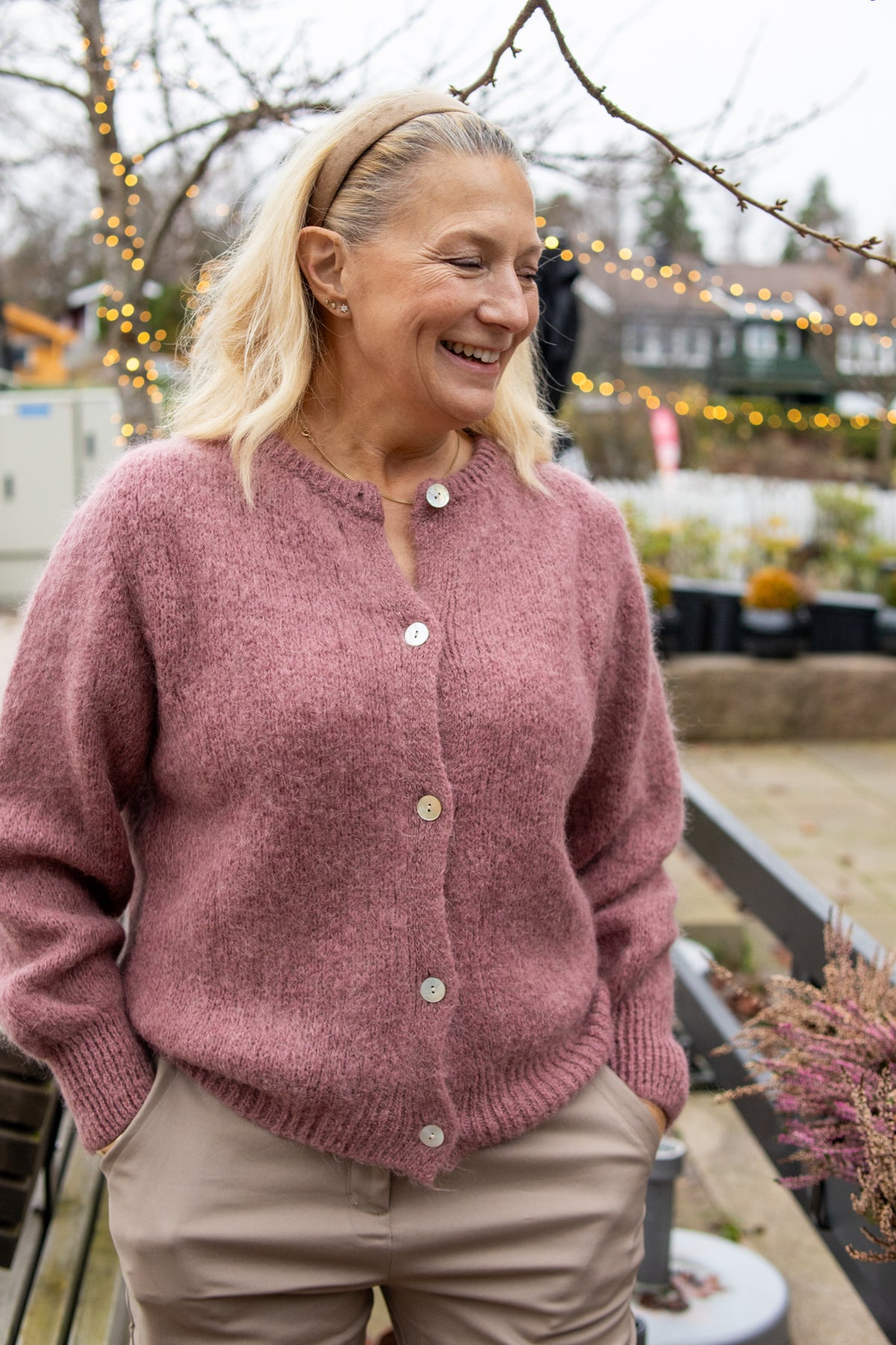 "Ida Cardigan - Camel" er en nydelig cardigan fra ByIC. Den er i en fussy mohair blanding med lange volumiøse ermer. Den lukkes i front med lekre perlemorsknapper.