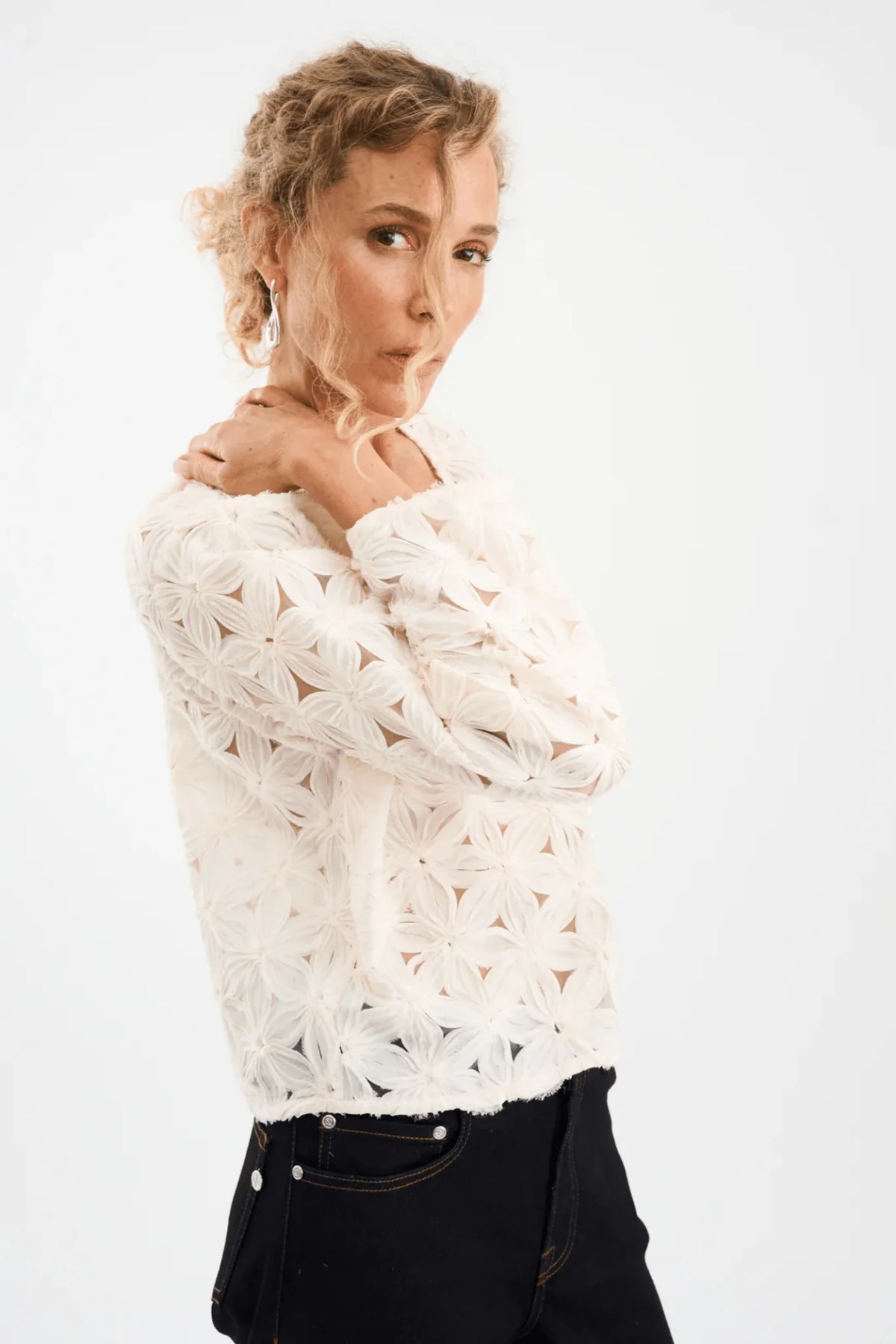 Cardiganen har V-utringning og små perler som knapper som setter et ekstra preg uten å ta fokus fra det lekre stoffet. Den er normal i størrelsen og har en kortere lengde, noe som gjør at den faller perfekt over livet. De lett nedtonede skuldrene gir en avslappet, men fortsatt velkledd silhuett. Kroppen er foret for komfort og en jevn finish, mens ermene forblir transparente for å bevare den lette, eteriske følelsen.