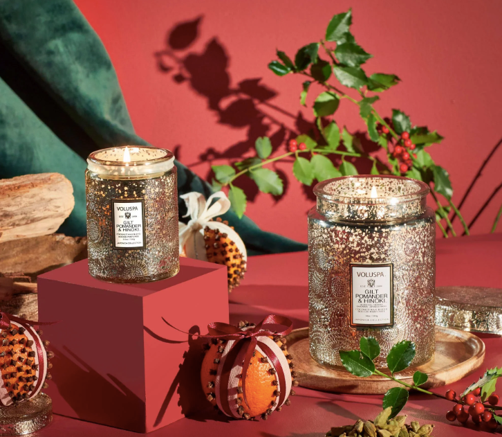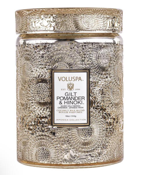 "Gilt Pomander & Hinoki" fra Voluspa. Duftlys i stor dekorativ glasskrukke med lokk. Stemningsfull duft av juleappelsin med nellik, bær, kardemomme og japansk hinoki.