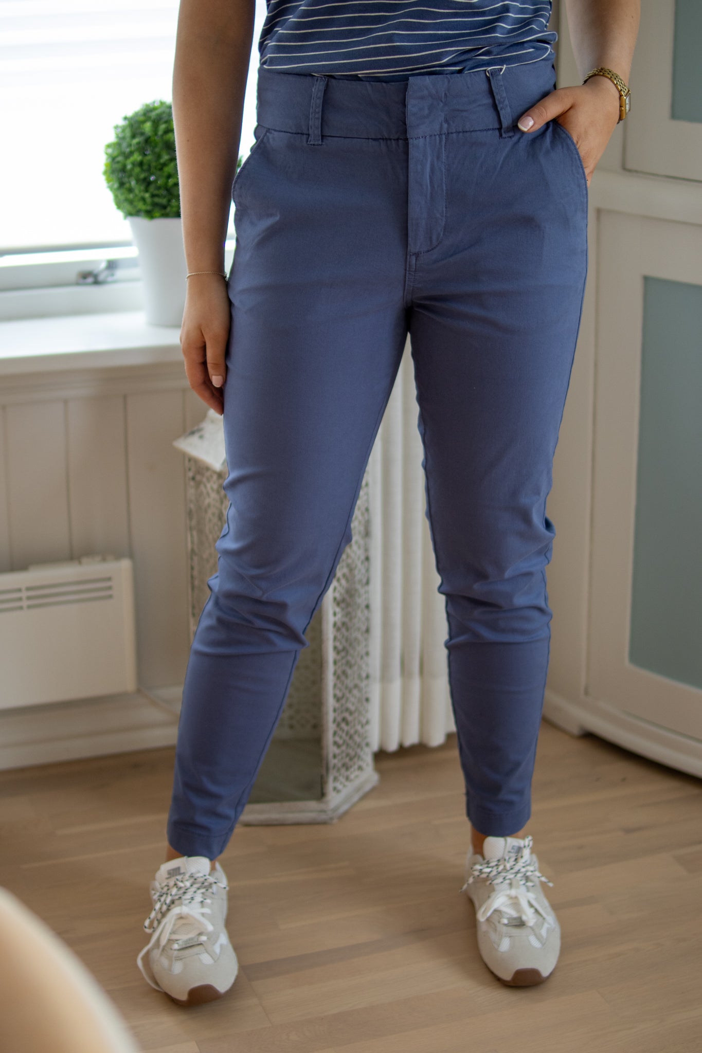 "Soffys Pants " fra Part Two. Klassisk chinos i en nydelig blå farge. Buksen har smale ben, mid-waist, stikklommer i sidene og tverssover-lommer bak. Behagelig passform med bred linning. God stretch. Lukkes med hempe og skjult glidelås i front.